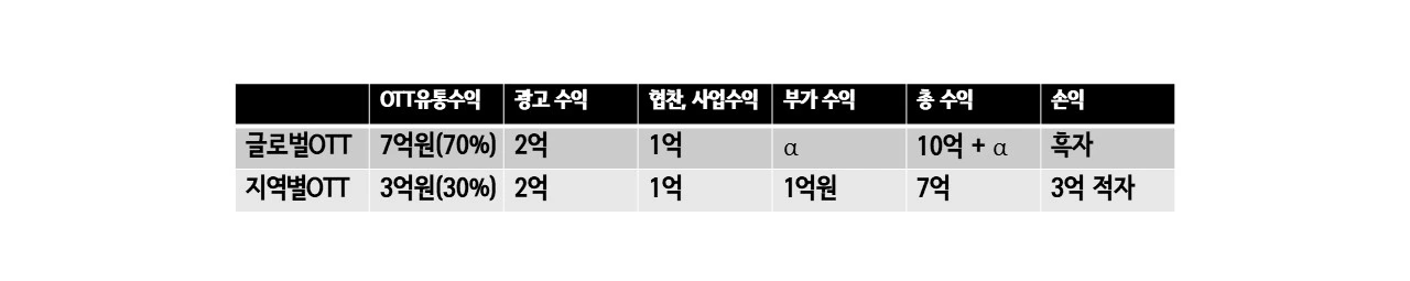 하지만 만약 넷플릭스에 팔지 못한다면 상황은 완전히 달라진다. 북중미의 Viki, 홍콩의 Viu, 일본의 U-Next와 같은 지역 OTT 유통사로부터는 제작비의 30% 정도만 투자받을 수 있다. 같은 10억 원 제작비 기준으로 지역 OTT 유통 수익 3억 원, 광고 수익 2억 원, 협찬 수익 1억 원, 부가 수입 1억 원을 합쳐도 총 7억 원에 불과하다. 회당 3억 원의 적자가 발생하는 것이다. 12부작 기준으로 보면 넷플릭스에 판매할 때 20억-30억 원의 흑자를 기대할 수 있지만, 그렇지 못할 때 36억 원의 적자가 발생한다. 현실에서는 이보다 더 심각해서 대부분 40억-50억 원 수준의 적자가 불가피하다.
