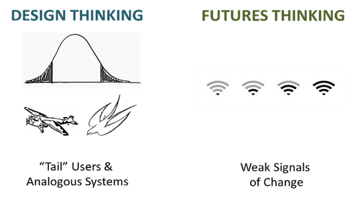 두 과정 모두 영감을 얻기 위해 주변부를 바라본다. 디자인 사고는 선도 사용자와 후행 사용자를 관찰해 숨겨진 필요를 드러내고, 유사한 시스템을 참고해 기회의 영역을 포착한다. 이 과정을 반복하며 점차 정교화한다. 반대로 미래 사고는 오늘날 나타나는 미약한 변화를 포착해 그것이 10~15년 뒤 어떤 모습이 될지 추측한다. 이때 직관적으로 사회적 맥락을 읽고 실행으로 연결하는 감각이 필요하다.