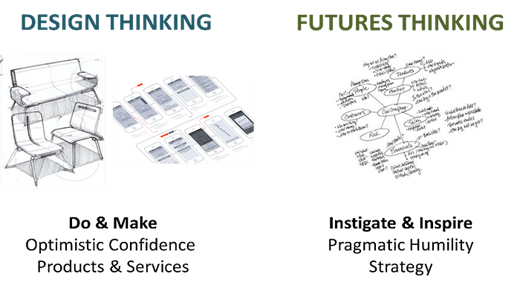 두 과정 모두 페르소나와 프로토타입을 통해 추상적 개념을 생생하게 만든다. 디자인 사고에서는 사용자 필요와 제품 아이디어를 구체화해 잠재적 사용자가 반응할 수 있도록 하고, 그 과정에서 유용한 피드백을 얻는다. 미래 사고에서는 미래의 삶을 그린 시나리오를 구체화해, 그 세계의 실제 아이템처럼 이해관계자 앞에 제시한다.