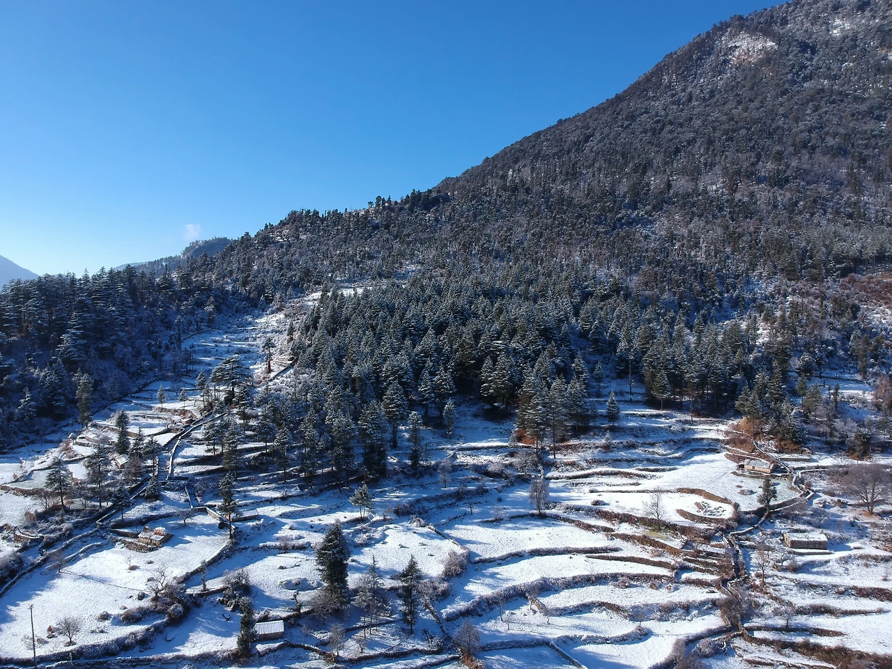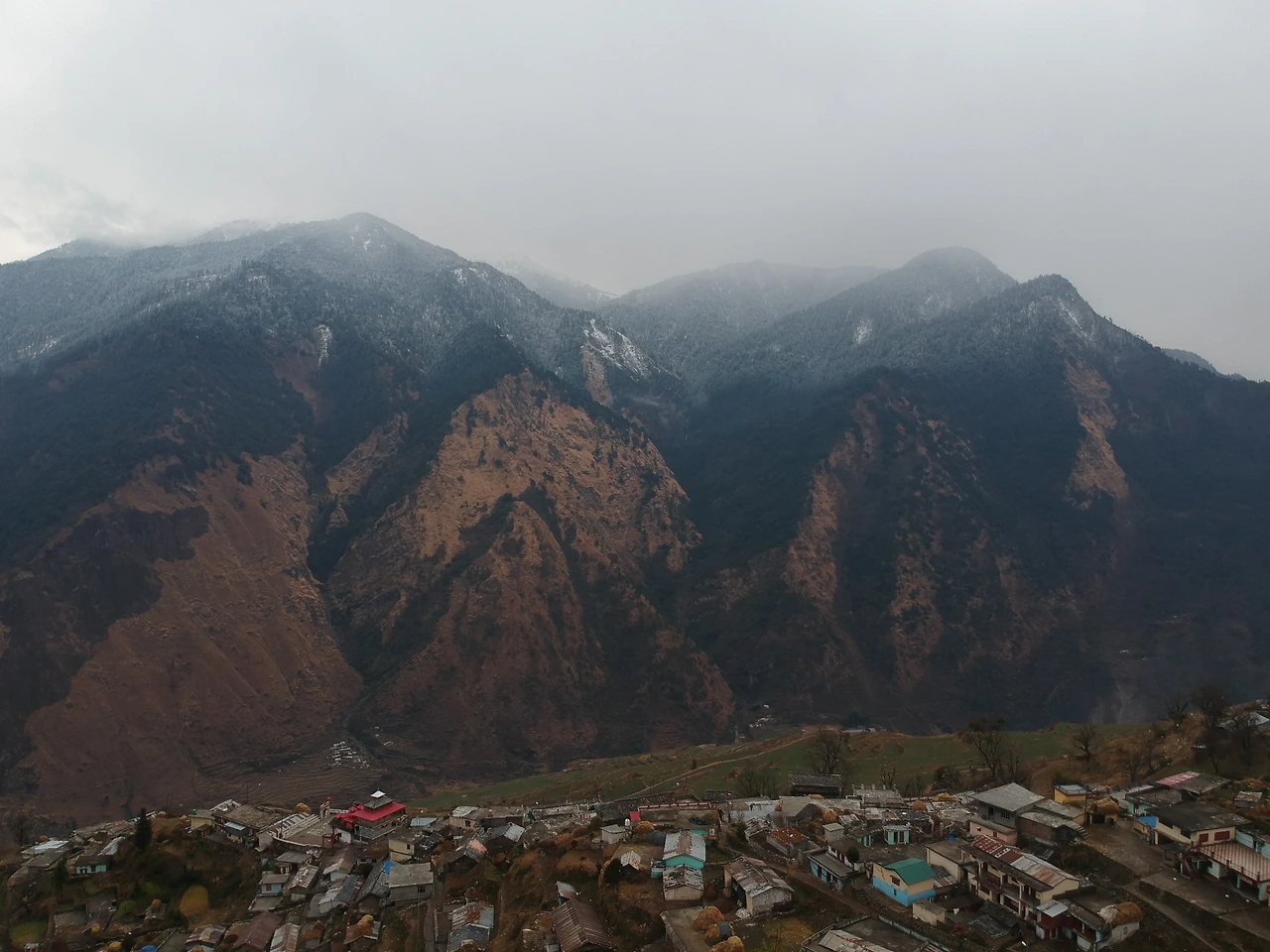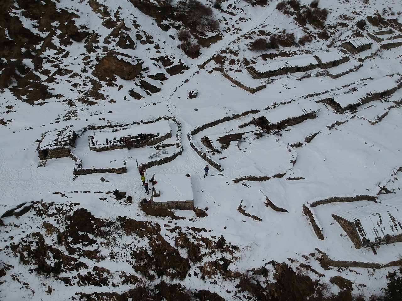 8시간 후 오후 4시 반쯤 도착하니 벌써 해는 뉘엿뉘엿... 번개같이 드론 한번 날리는데 동네 할아버지분들도 나오셔서 나랑 같이 폰에 있는 화면 감상하심... 처음으로 한국인도 보시고 드론도 보신 거란다. 산속이다 보니 해는 바로 져버리고... 아~~ 눈이 내리기 시작한다. 심상치 않다 내일 출발할 수 있을까...