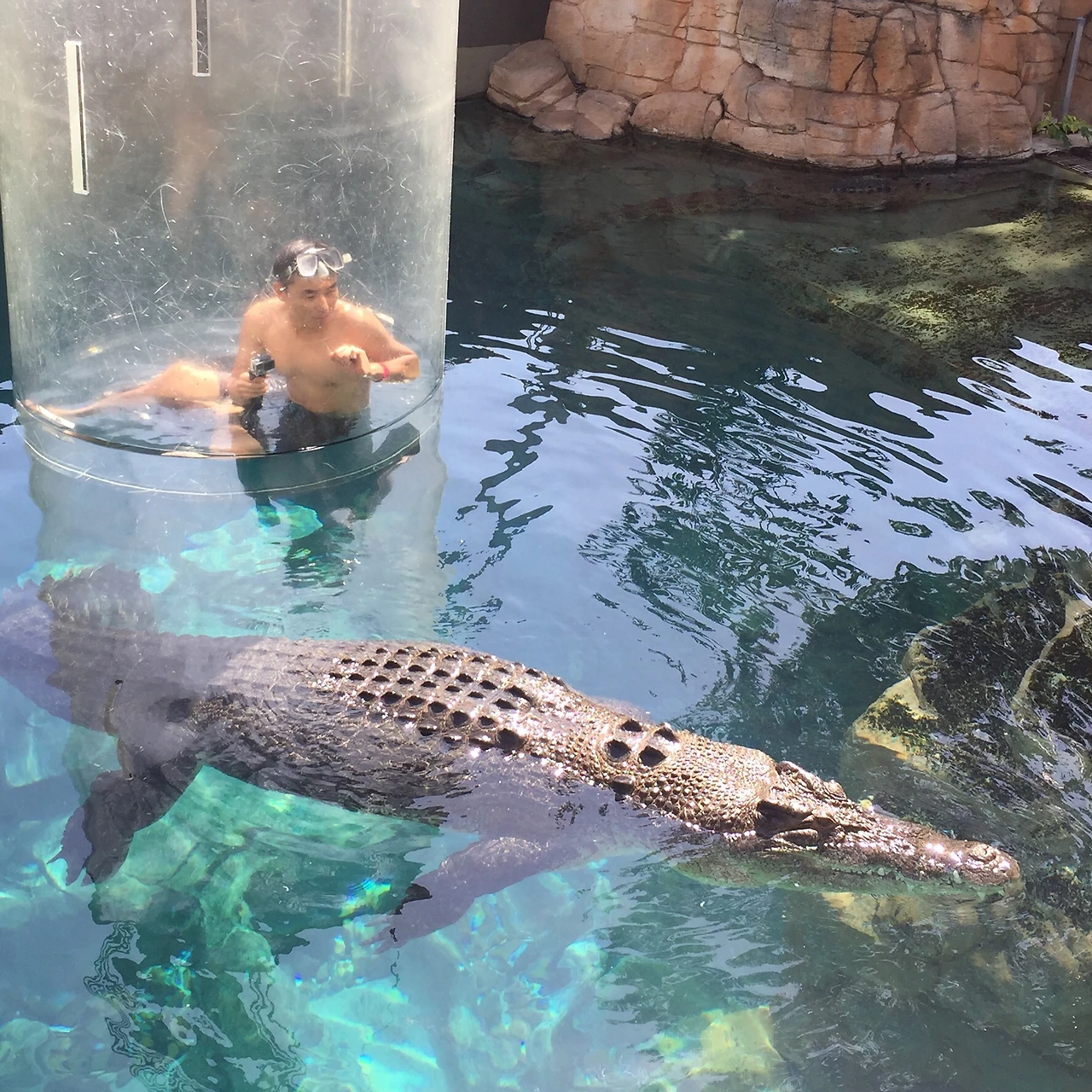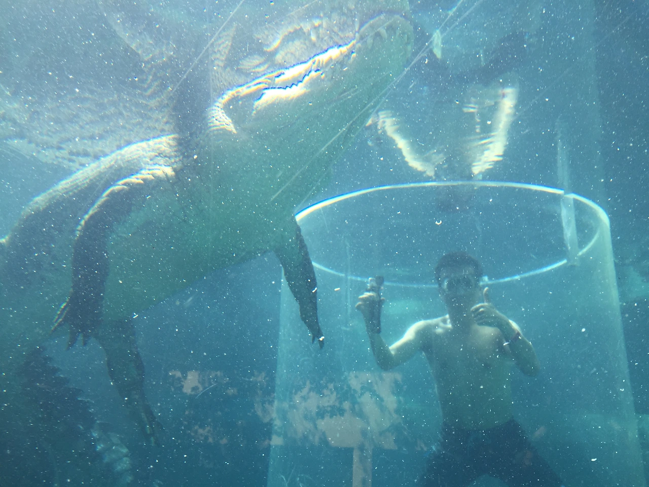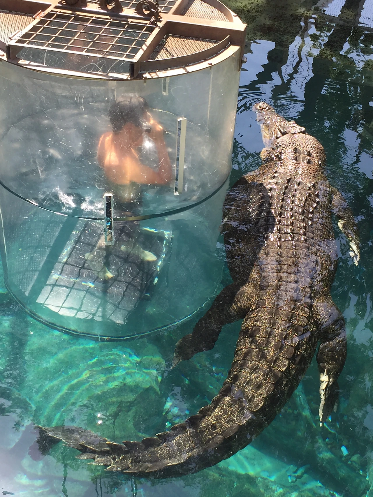 주의 사항을 들은 후 수족관으로 가서 강화 플라스틱으로 만들어진 케이지에 들어가는데 두께가 10cm 정도로 엄청 두껍고 케이지 위를 통해서 들어가면 사진과 같이 케이지 위도 막는다. 하지만 산소통이 없기 때문에 케이지 전체가 들어가지는 않고 2/3 정도까지 들어갔나 나왔다 반복한다. 두꺼운 강화 플라스틱 케이지에 안전 쇠사슬도 있고 해서 문제는 없어 보이는데, 막상 저 안에 들어가서 은근히 소름이 돋는다. 쇠사슬이 끊어져서 물속으로 빠지면 어떻게 탈출하지? 하는 생각도 잠깐 들 정도였다. 투어를 두 군데서 진행을 하는데 필자가 들어간 곳은 상처가 있는 가장 큰 악어가 아닌 그것보다는 좀 더 작은 악어였다. 그래서 앞발이 있다. 아쉬웠다...
