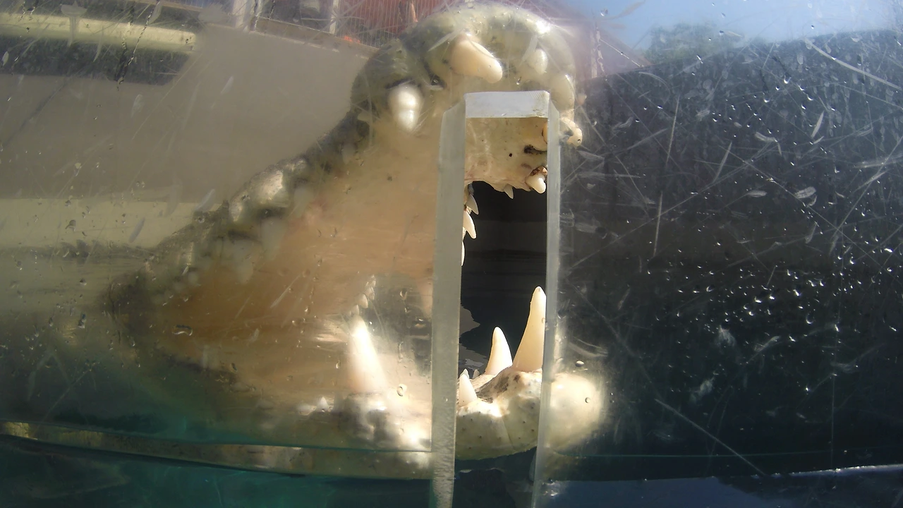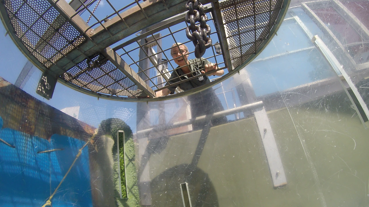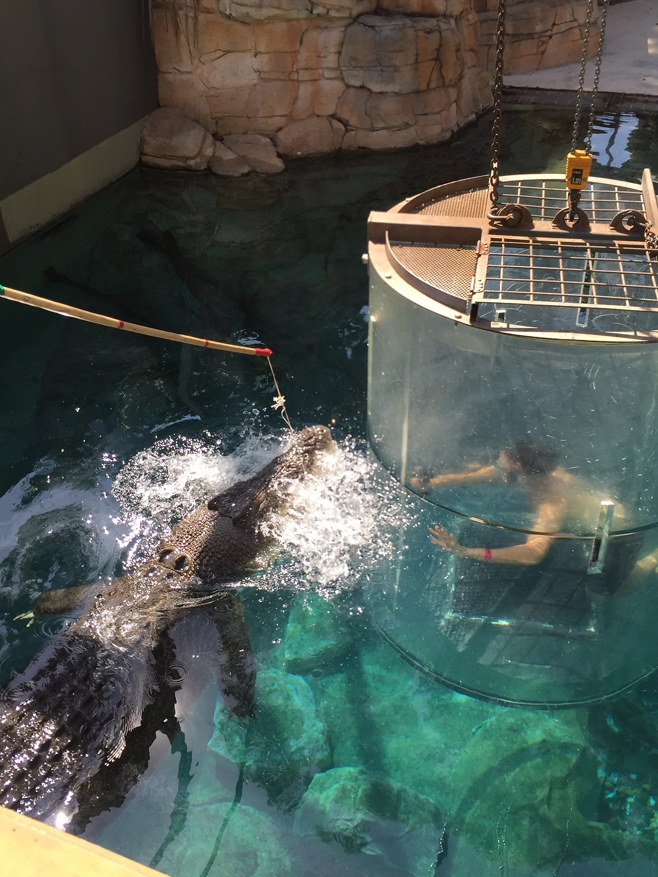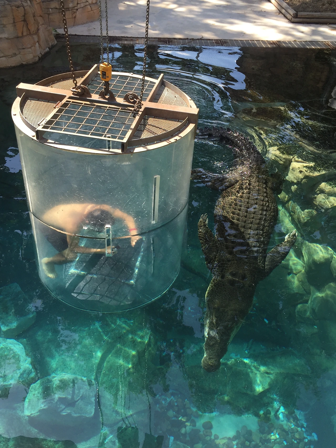 주의 사항을 들은 후 수족관으로 가서 강화 플라스틱으로 만들어진 케이지에 들어가는데 두께가 10cm 정도로 엄청 두껍고 케이지 위를 통해서 들어가면 사진과 같이 케이지 위도 막는다. 하지만 산소통이 없기 때문에 케이지 전체가 들어가지는 않고 2/3 정도까지 들어갔나 나왔다 반복한다. 두꺼운 강화 플라스틱 케이지에 안전 쇠사슬도 있고 해서 문제는 없어 보이는데, 막상 저 안에 들어가서 은근히 소름이 돋는다. 쇠사슬이 끊어져서 물속으로 빠지면 어떻게 탈출하지? 하는 생각도 잠깐 들 정도였다. 투어를 두 군데서 진행을 하는데 필자가 들어간 곳은 상처가 있는 가장 큰 악어가 아닌 그것보다는 좀 더 작은 악어였다. 그래서 앞발이 있다. 아쉬웠다...