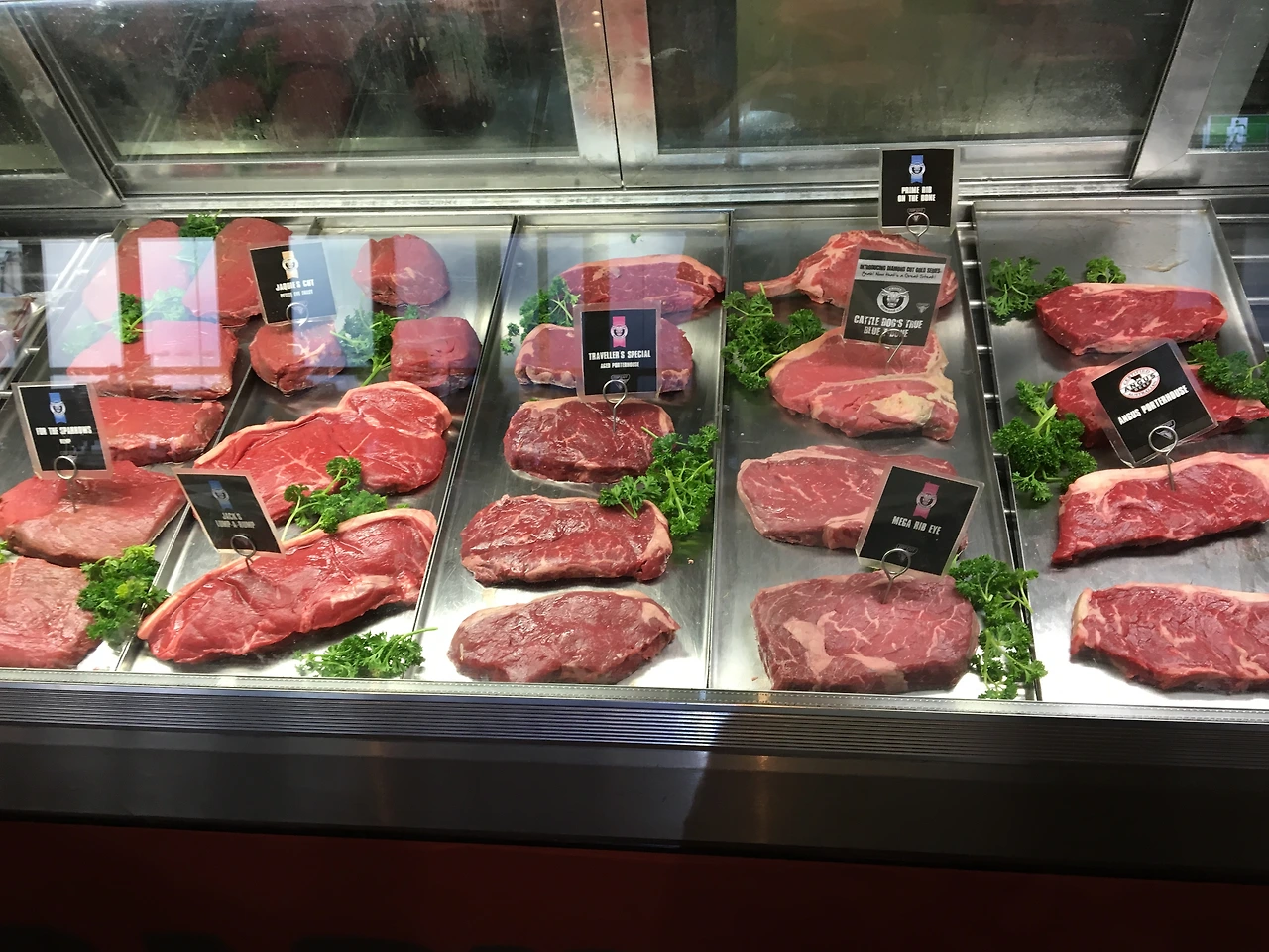악어와 수영을 한 대견한 나에게 아웃백에 왔으니 스테이크를 선물로 줘야 하지 않겠나? 아웃백 잭(Outback Jacks)이라는 스테이크 하우스(Steak House)를 리뷰를 보고 갔다. 아래와 같이 스테이크 고기를 고르면 원하는 데로 구워준다. 소고기의 나라 호주답게 스테이크 가격이 착했다.