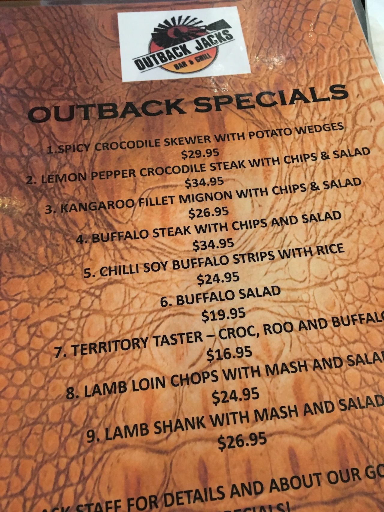 메뉴에 보면 캥거루 스테이크, 악어 스테이크도 있었는데, 차마 먹어보지 못했다. 나중에 악어 소시지만 먹어봤는데 지금 생각하면 살짝 아쉽다. 스테이크는 당연히 훌륭했다!! 엄지 척!!