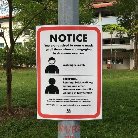 현재 싱가포르는 모든 공공장소가 다 폐쇄되어있다. 항시 마스크 착용은 필수지만 러닝 할 때와 자전거 탈 때만 예외이다. 외부에서 유일하게 마스크 착용을 하지 않아도 된다. 걷기는 마스크 착용을 해야 한다. 그리고 러너들 사이에는 안전거리를 유지해야 한다.