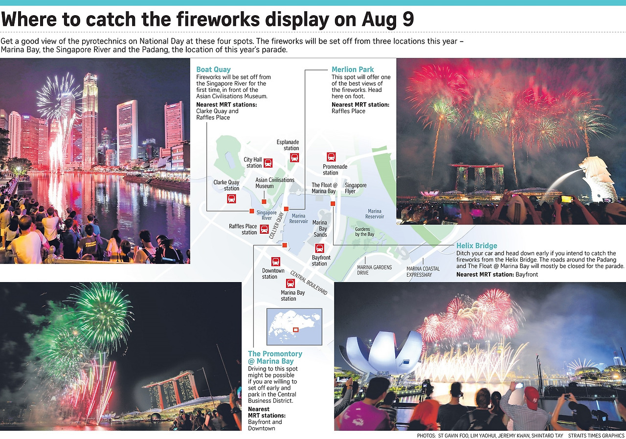 다음과 같이 마리나 베이 근처에서 불꽃놀이를 즐길 수 있는 장소들을 참고하자.