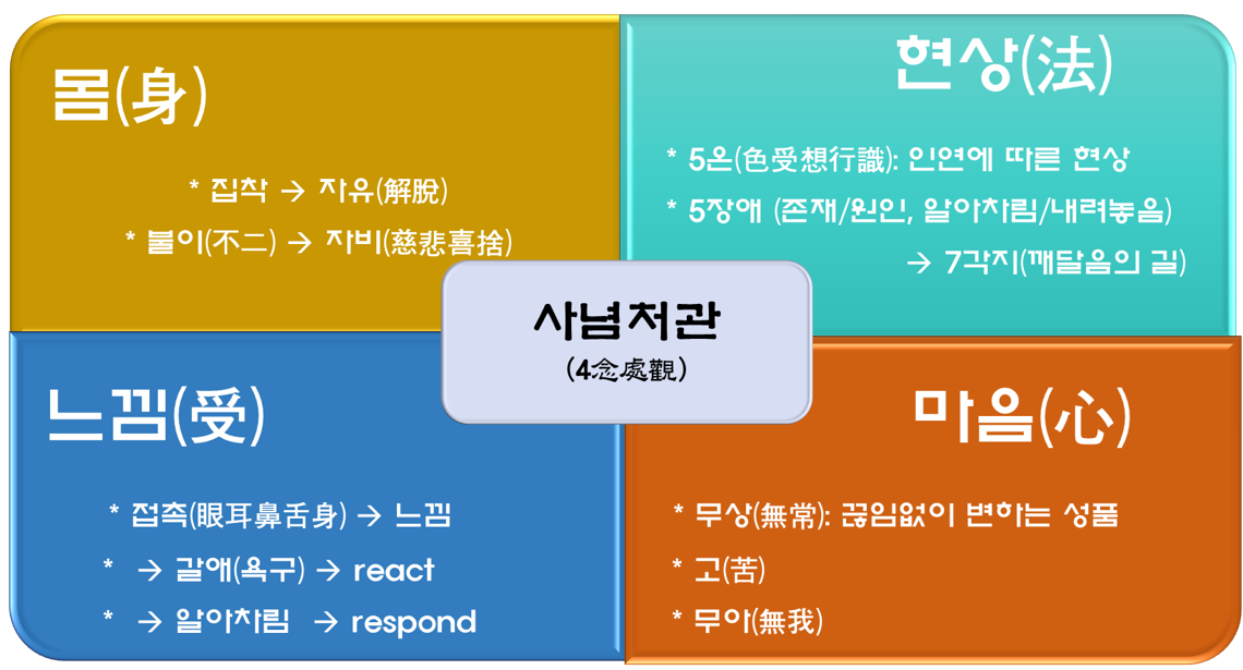 * 사념처의 '념(念)'은 팔리어 '사띠(sati)'의 한문 번역으로, 영어에선 mindfulness라 하고, 우리말로는 마음챙김 또는 알아차림으로 번역되고 있다.