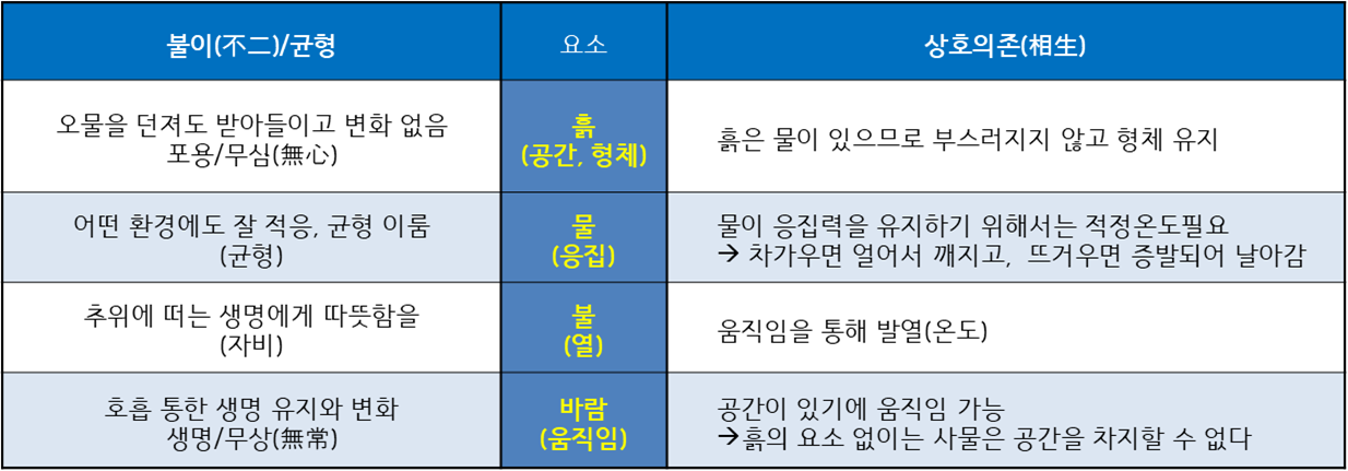 나를 이루고 있는 몸을 관찰하면, 뼈(지), 피(수), 피부(화)로 구성되어 있고, 호흡(풍)을 통해 생명을 유지하고 있듯이, 다른 모든 생명들 또한 지수화풍(흙, 물, 불, 바람)의 4대 요소로 구성되어, 다르지 아니할 뿐 아니라(불이), 외부로부터의 4요소, 즉, 음식(지), 수(물), 날씨(화)와 공기(풍)의 공급에 의존하여 생명을 유지하고 있다는 상호의존성과, 배설과 죽음을 통해 자연으로 회귀하여 다시 4요소로 분해되는 과정을 순환하는 연기와 생멸을 거듭하고 있음을 깨닫게 하기 위함이다.