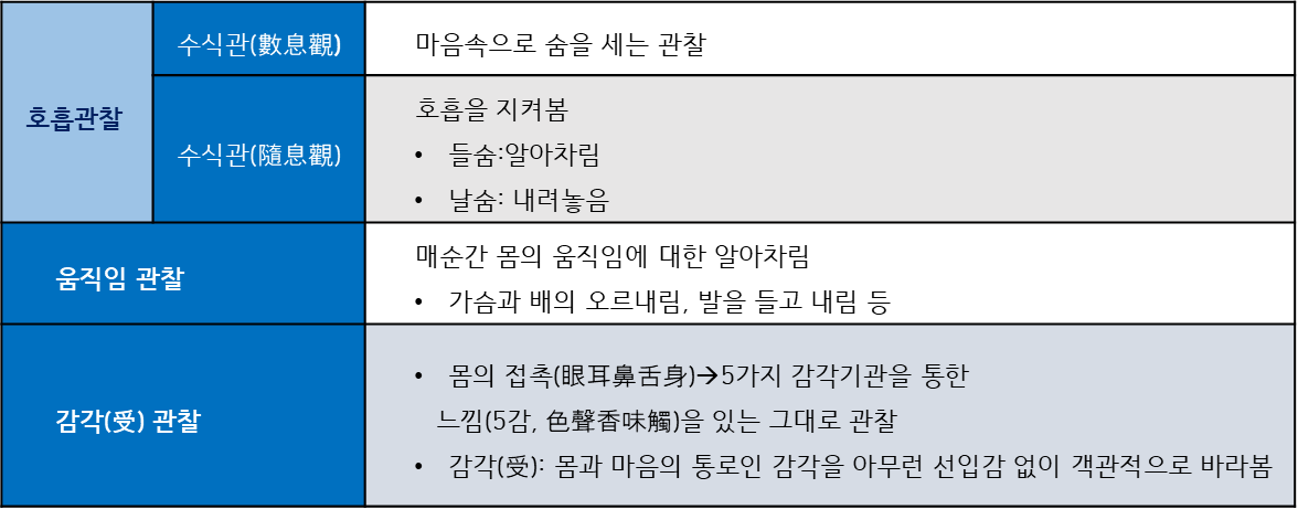 첫째, 가장 대표적인 몸(身)의 관찰법으로는 (1) 숨을 세거나 객관적으로 지켜보는 호흡 관찰과 (2) 가슴과 배의 오르내림이나 발을 들고 내림과 같은 몸의 움직임 관찰을 들 수 있다.