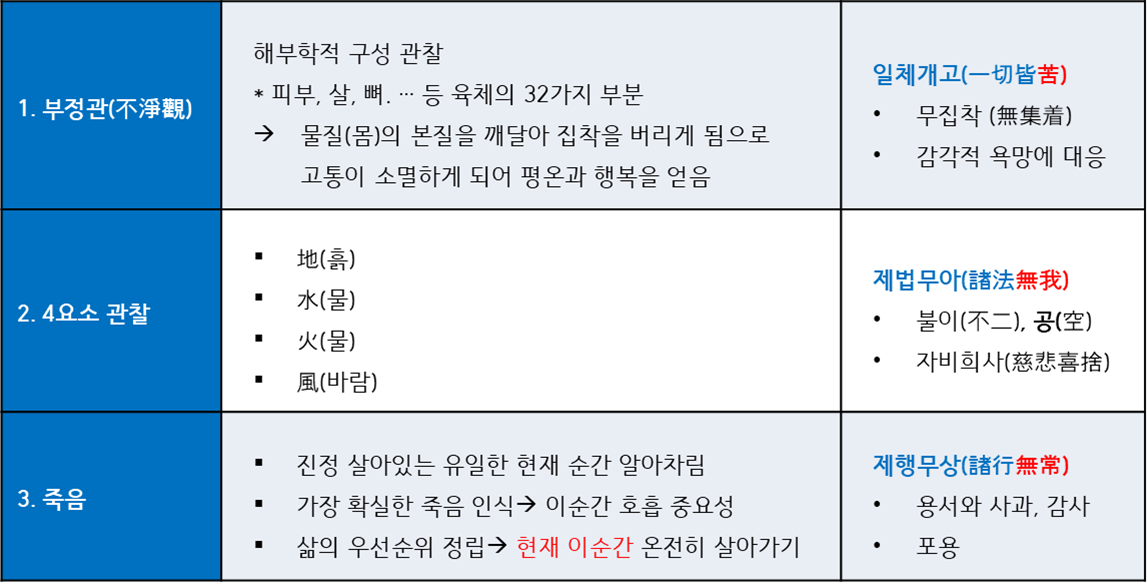 우리 몸의 피부, 살, 뼈, 피, 오물 등 32가지 부분에 대한 해부학적 심층 관찰을 통해, 몸과 물질의 본질이 아름답지도 탐할 가치조차 없는 부정한(깨끗하지 않음) 것임을 깨달아, 감각적 욕망에 대한 경향성에 대응하여 이를 통제하도록 이끌기 위함이다.