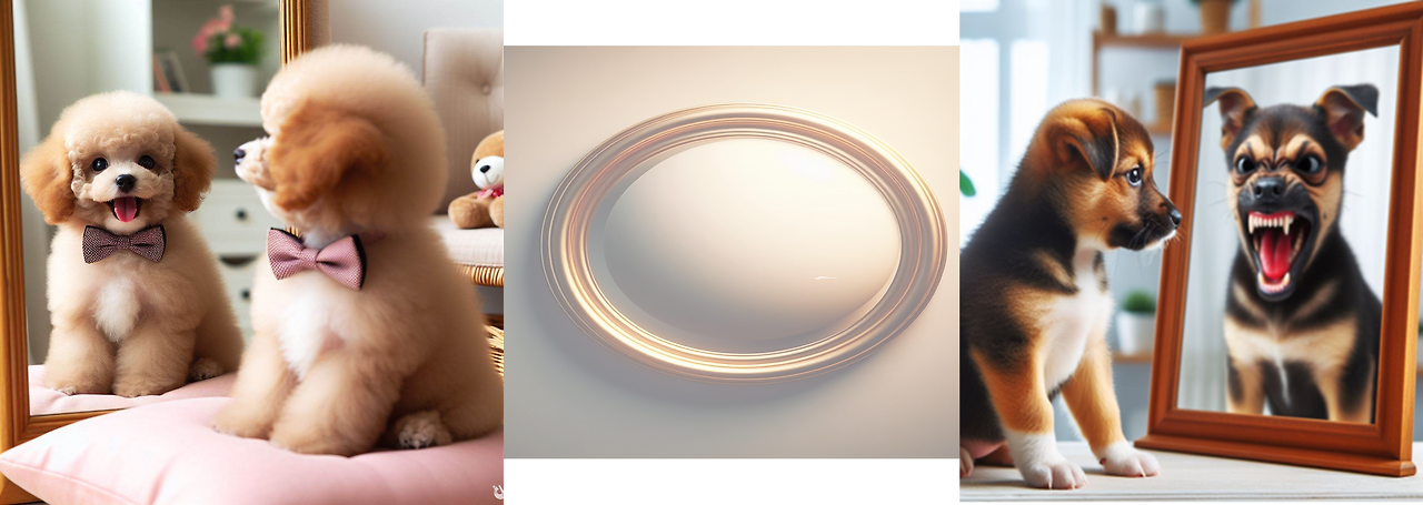 여기, 토이 푸들과 진돗개가 있다 (대상). 어떤 마음은 너무나 사랑스러워 안아주고 싶어 하는 반면, 또 다른 어떤 마음은 푸들에게는 웃음 보일 수 있지만, 진돗개는 무섭다 (아는 마음과 느낌). 그런데 그 앞에 대형 거울이 놓여 있다. 푸들이 왔다 가던, 진돗개가 왔다 가던, 안으려는 사람이 비추이던, 도망가는 사람이 피추이던 그저 지켜볼 뿐, 그냥 그 자리 그대이고, 아무런 흔적도 남김이 없다. 무심이다. (지켜보는 마음)