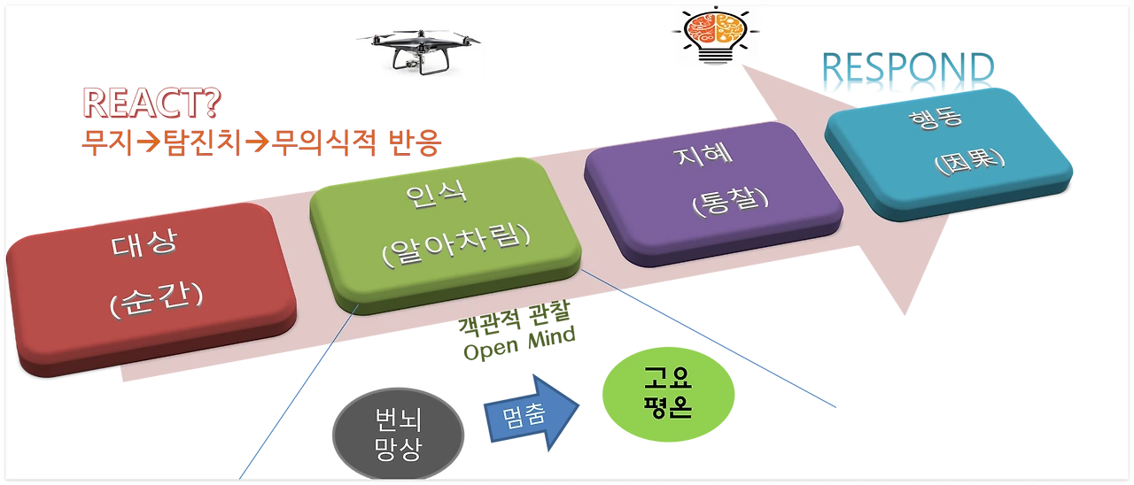 React(반응)는 무의식적, 반사적 행동인 반면, Respond(대응)는 알아차림을 통해 지혜롭게 판단된 행동이다.
