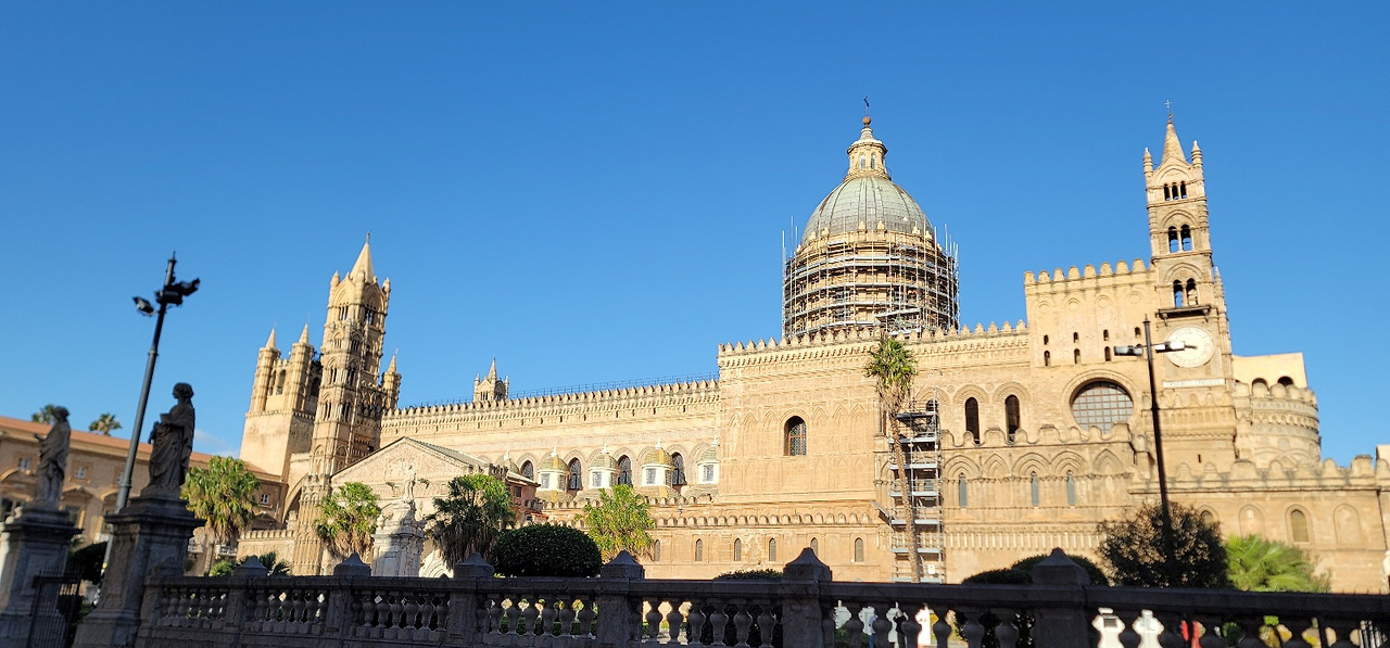 #팔레르모는 시칠리아의 수도이다. 시칠리아는 지중해에서 가장 큰 섬으로 제주도의 14배 크기라 한다. 팔레르모는 BC 8세기 페니키아의 식민도시가 기원으로, 그리스, 로마와 비잔틴의 지배를 거쳐, 9세기 아랍 지배시기부터 번창하여, 11세기 노르만족이 시칠리아 왕국을 건설하여, 다양한 문화가 융합된 도시다. 구시가지 곳곳에서 12세기 시칠리아 왕국시대의 화려한 도시 흔적을 찾아볼 수 있는데, 독일의 대문호 괴테는 팔레르모를 세상에서 가장 아름다운 도시로 극찬했다 한다.