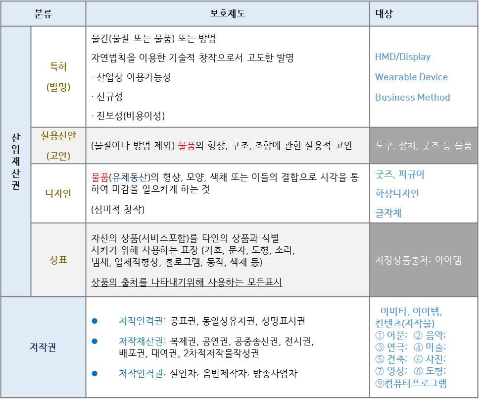 현실 공간의 유형상품보다는 가상공간의 가상 이미지 중심의 지식재산이 중심으로 자리하게 되는 환경기술적 특성상, 실용신안, 디자인권보다는 상대적으로 상표와 저작권이 보호와 분쟁의 중심축으로 자리 잡게 될 것으로 예상된다.