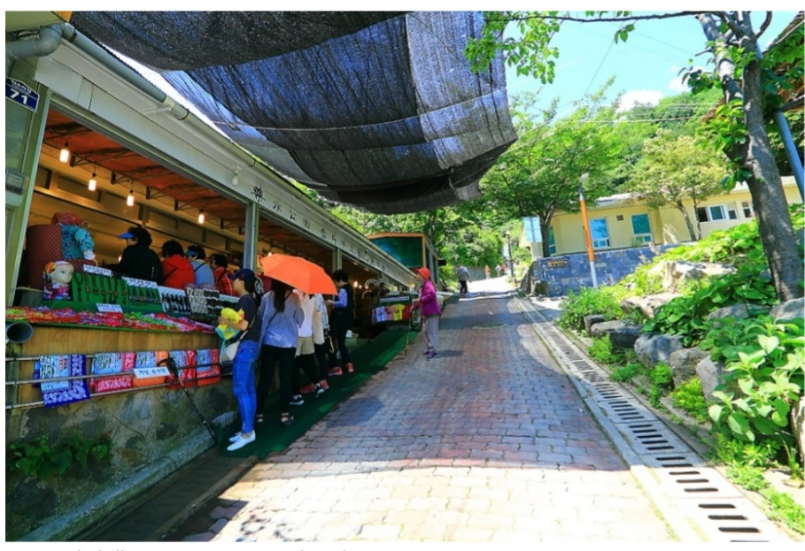 케이블카에서 내려 전망대로 향하는 쉼터에 들리니 앞서 와 있는 사람들로 휴게소는 북적북적 인산인해다. 케이블카를 타고 이곳에 와서 한참 동안 쉬었다가 가는 여행객들이었다.