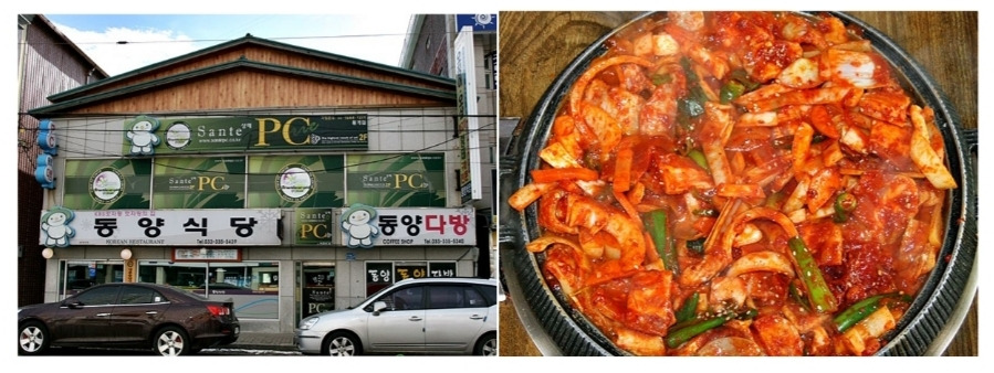 횡계 시가지로 나서면 평창의 마스코트 귀여운 눈사람이 들어간 간판에는 동양 제일이란 의미일까? 동양식당에서는 일미인 오삼불고기를 맛볼 수 있는 원조 오삼불고기집이다.
