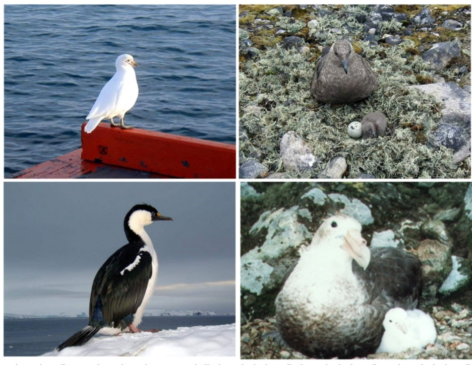 남극의 새들 남극비둘기, 도둑갈매기 어미와 새끼, 자이언트페트럴 어미와 새끼, 그리고 가마우지