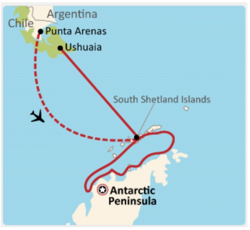 푼타 아레나스 공항에서 군 수송기를 이용하여 사우스 셰틀랜드 제도 (South Shetland Islands)의 킹 조지 아일랜드 (King George Island)까지 약 두 시간 가량 이동한 후 킹 조지 아일랜드에 도착하면 칠레의 프레이 (Frei) 남극 연구기지와 러시아의 벨링하우젠 (Bellingshausen) 기지를 방문하게 된다. 이들 기지가 있는 필즈 베이 (Fildes Bay)에 모여 고무보트인 조디악을 타고 크루즈에 오르면 사우스 셰틀랜드 제도를 출발 남극 반도의 서쪽 해안으로의 랜딩이 이어지게 된다. 이 크루징에서 빙하와 유빙이 빚어내는 절경을 감상하고, 각종 바다새들과 남극하면 젤 먼저 생각나는 여러 종류의 펭귄들, 바다표범, 고래 등 남극의 야생 동물들을 만나게 된다. 리빙스톤 아일랜드 (Livingston Island), 포트 로크로이 (Port Lockroy), 피터만 아일랜드 (Petermann Island), 파라다이스 베이 (Paradise Bay), 쿠버빌 아일랜드 (Cuverville Island), 디셉션 아일랜드 (Deception Island)에서 랜딩하여 남극의 절경을 느끼는 경험을 통해 저절로 탄성을 자아내게 만드는 르마이어 해협 (Lemaire Channel)의 아름다운 경치를 감상하는 것도 빼 놓을 수 없다. 남극의 척박한 자연 환경을 극복한 생명체들을 만나고, 남극해의 차가운 물살을 가르는 조디악 크루징과 남극 생태계에 대한 강의는 남극에서 보내는 시간들을 더욱 의미 있게 만들어 줄 것입니다.