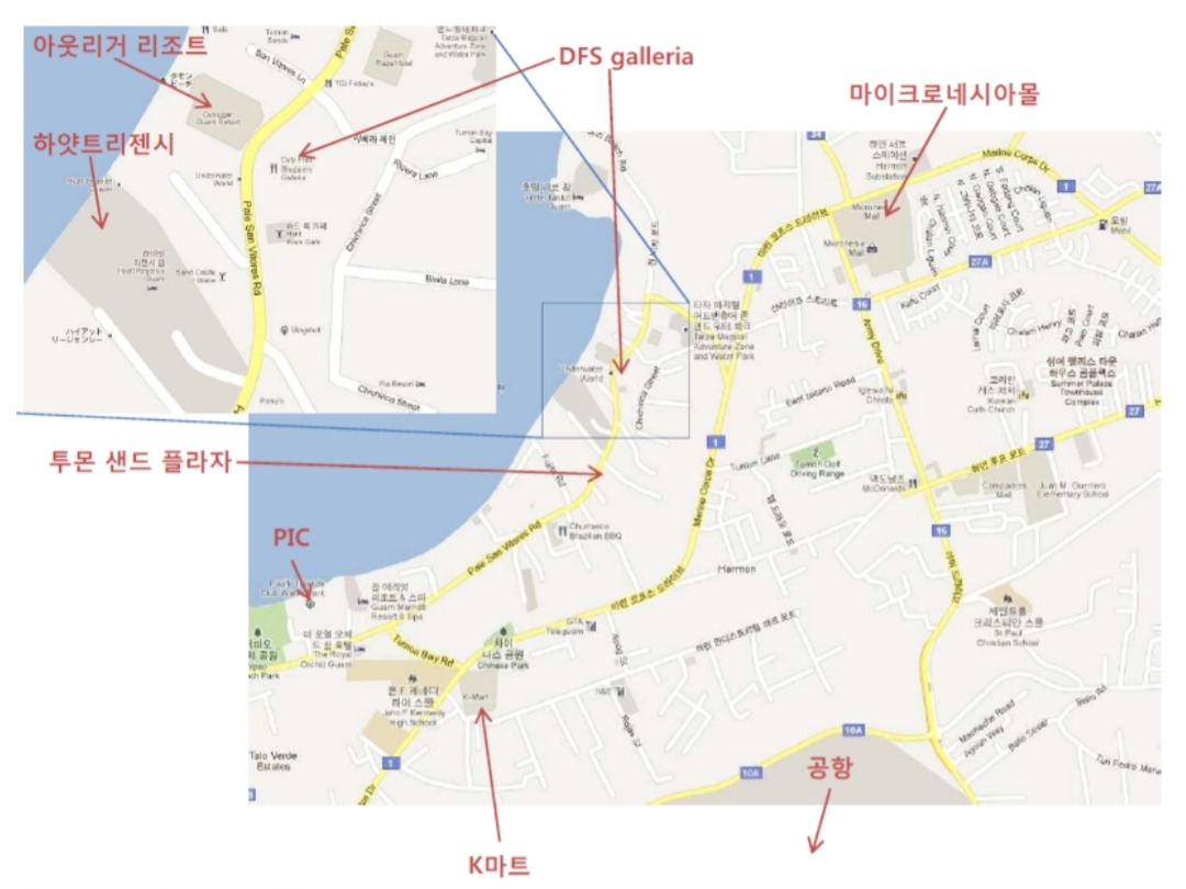 괌에서의 교통은 택시가 가장 편리하지만 비싼 편으로 트램 시간과 노선을 잘 확인해서 트램 타는 걸 권장한다. 중심가로 가기 위해 호텔에서 T갤러리아 면세점으로 가는 무료 택시 이용을 권장한다. 면세점 차원의 무료 서비스이다.