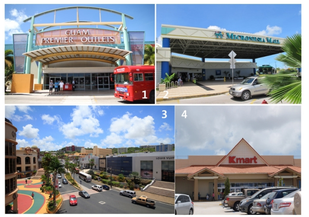 괌의 주요 쇼핑몰 좌상단부터 시계방향으로 GPO, 마이크로네시아몰, Kmart, T-갤러리아