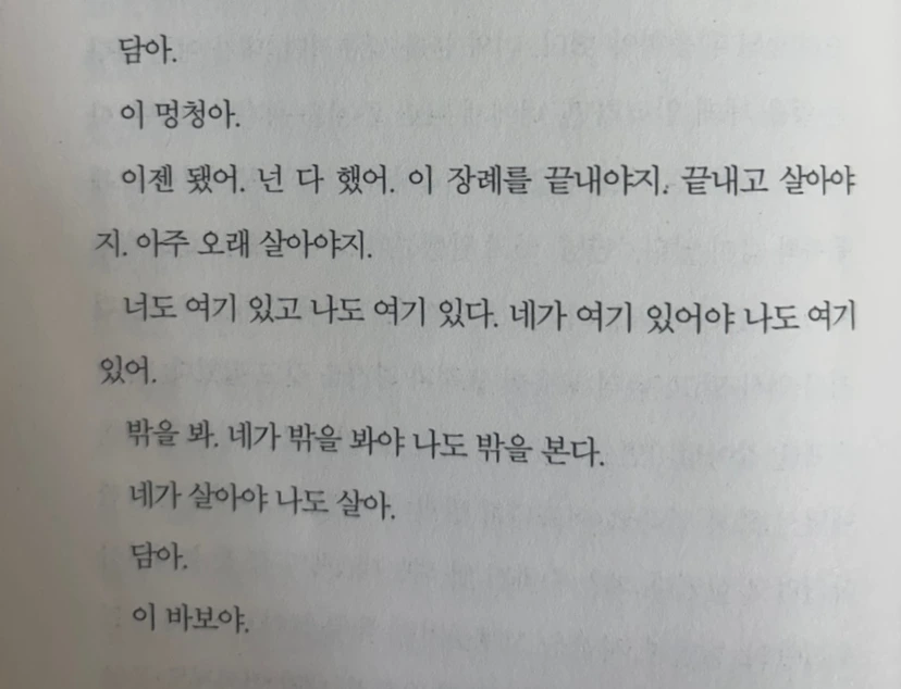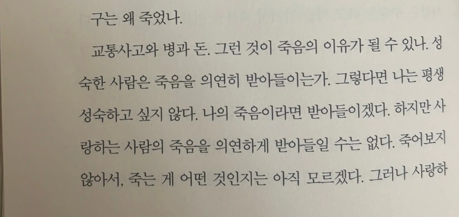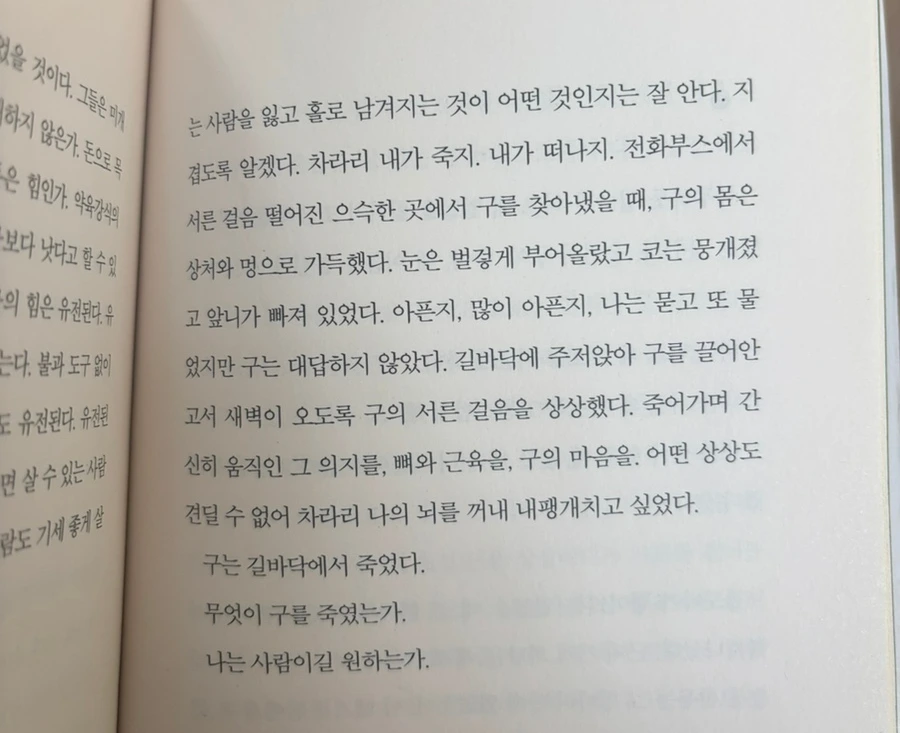 구는 죽는 순간까지 생각했다. 희망 없는 세상에선 살 수 있었지만 담이 없는 세상에선 살고 싶지 않았다. 그래서 죽고 싶지 않았다. 구도 알고 있었을 것이다. 서로에 대한 상실감은 그 무엇으로도 채울 수 없다는 걸 알기에 죽고 싶지 않았을 것이다.