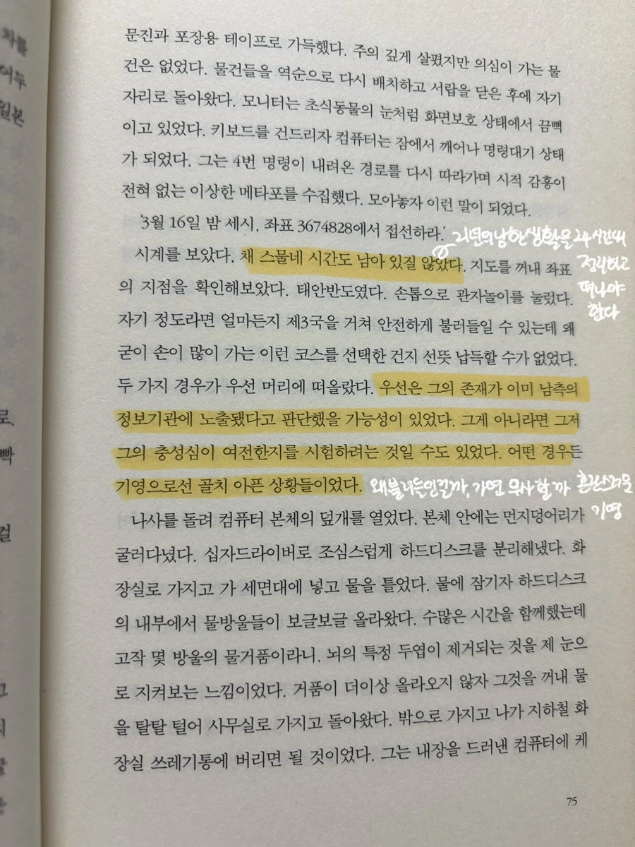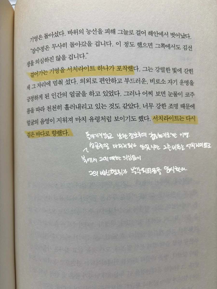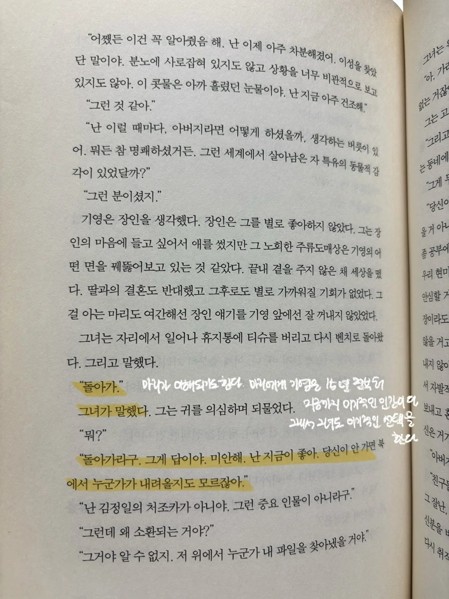 저 또한 빛의 제국을 읽으며 기영이 가장 힘든 인물일 거라고 생각했어요. 갑자기 돌아오라는 북한의 지령에 자신은 어떤 선택을 해야 하는지 고민에 빠진 그의 모습을 보면서 안타깝기도 하고 함께 불안함을 느끼기도 했습니다.