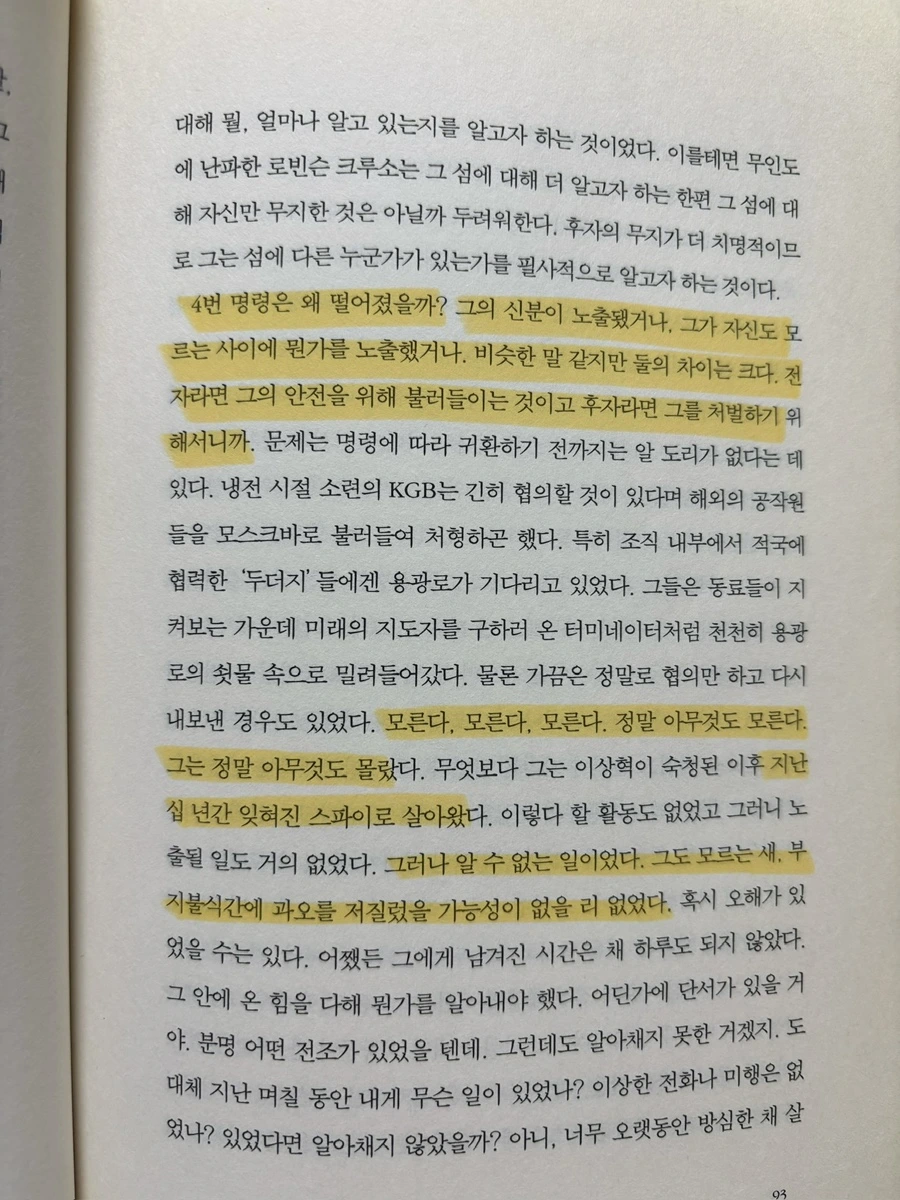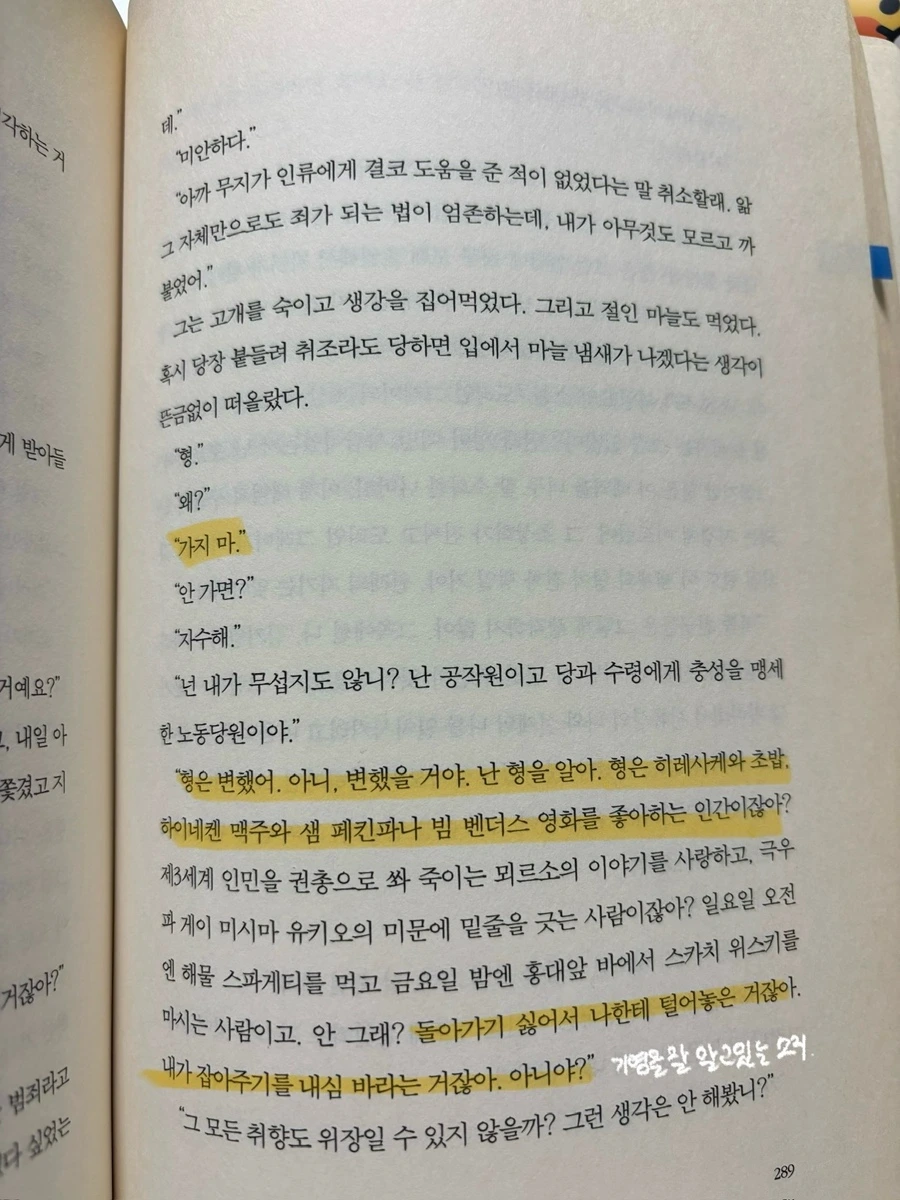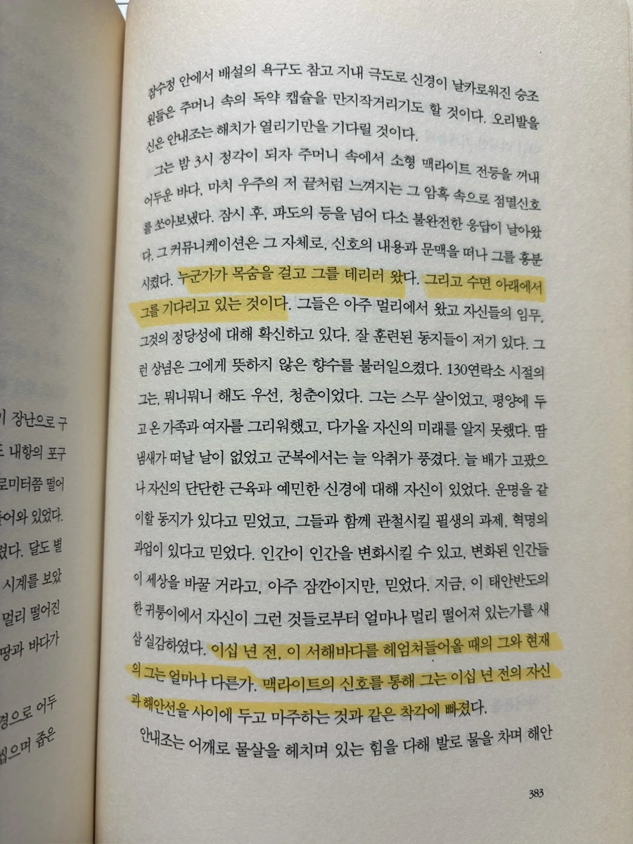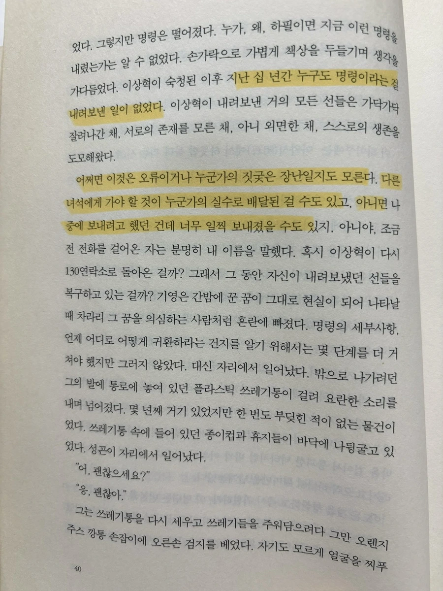 저 또한 빛의 제국을 읽으며 기영이 가장 힘든 인물일 거라고 생각했어요. 갑자기 돌아오라는 북한의 지령에 자신은 어떤 선택을 해야 하는지 고민에 빠진 그의 모습을 보면서 안타깝기도 하고 함께 불안함을 느끼기도 했습니다.