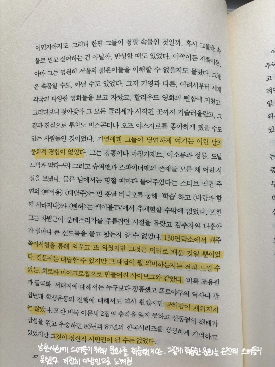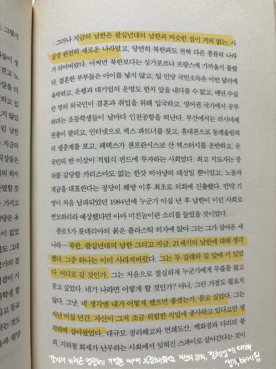 기영 역시 소설 내내 남한의 소비재들을 마음껏 이용하는 모습을 보여줬습니다. 앞서 나왔던 ‘여긴 책으로 둘러싸여 있지만 북은 벽으로 둘러싸여 있다’