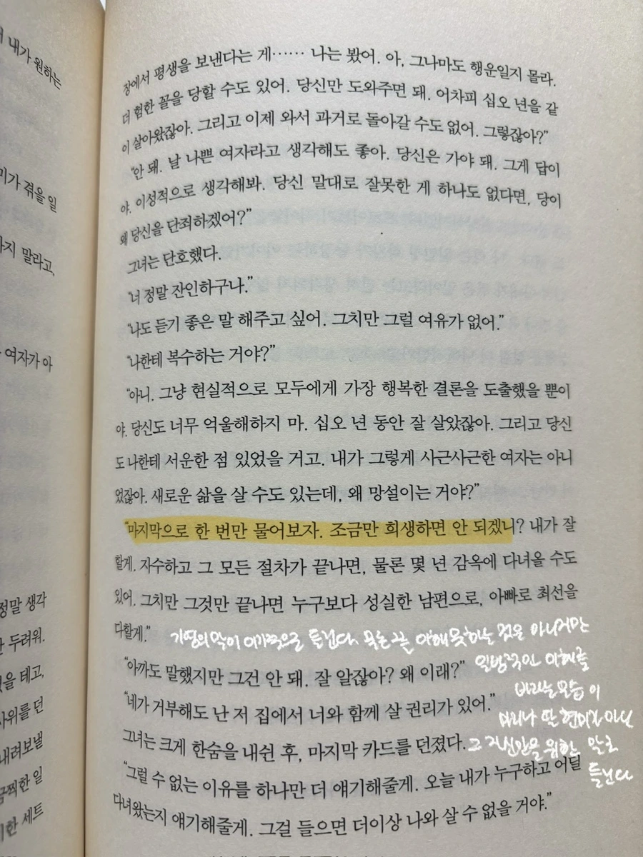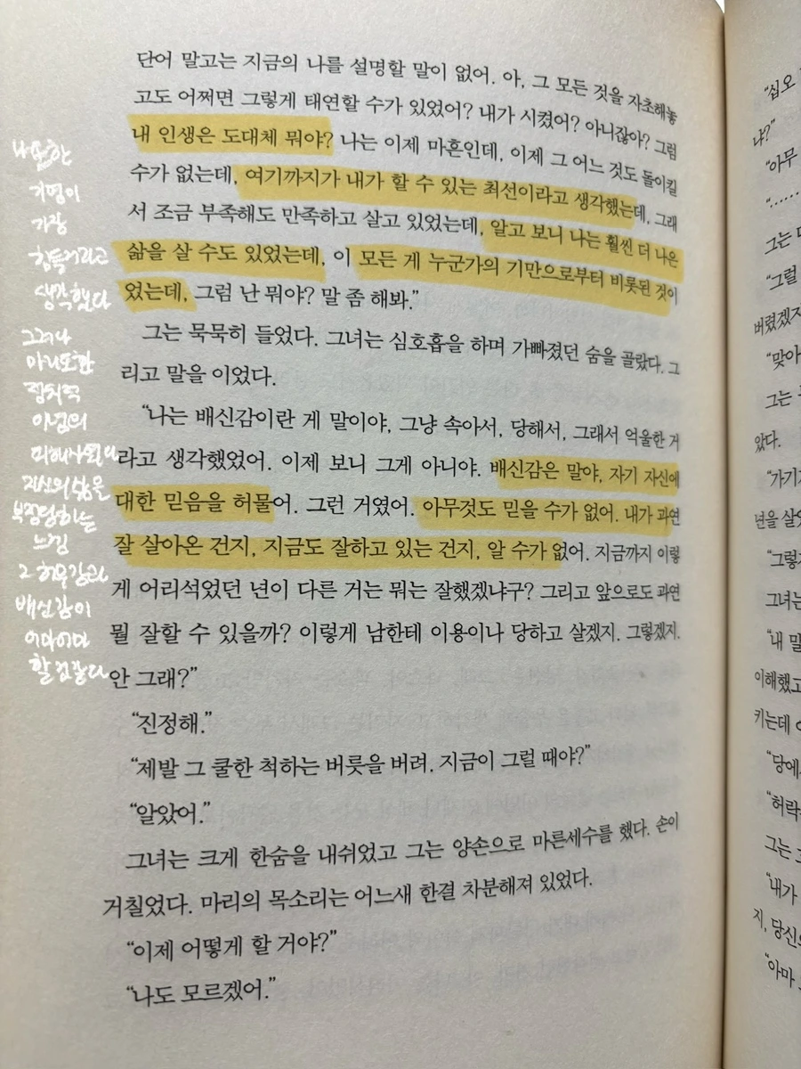 마리는 기영의 고백에 함께 했던 15년의 세월이 부정당하는 기분을 느낍니다. 기영과 부부로 사는 동안 기영이 마음을 열지 않는 게 자신의 잘못이라고 생각하며 움츠러들어 살았다는 마리. 두 사람 다 누가 더 고통스러운지 비교할 수는 없는 것 같아요. 그저 둘 다 정치적 이념 갈등의 피해자라는 생각이 들었어요.