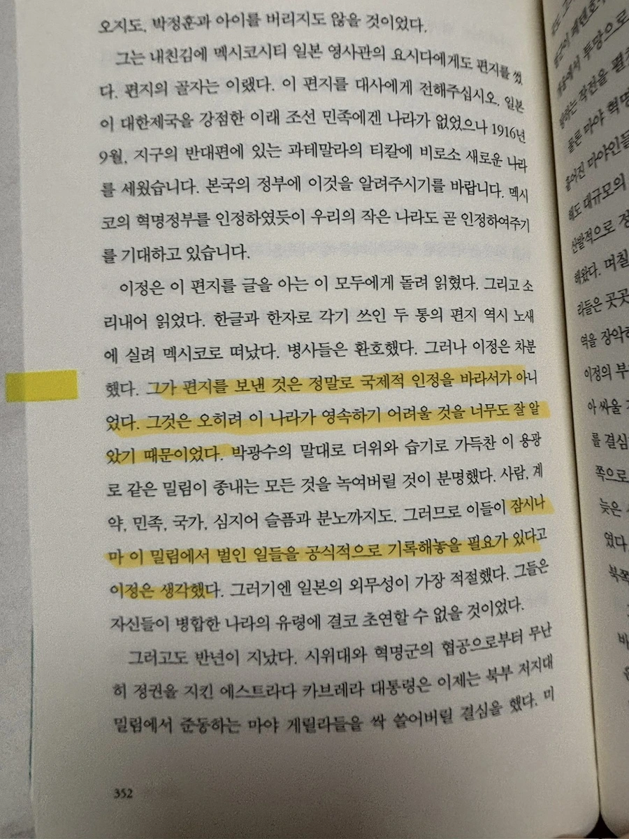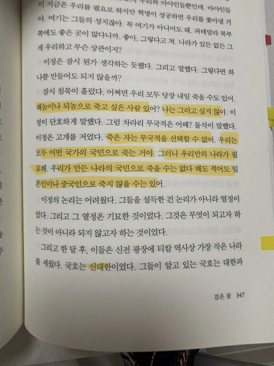 그 말이 이정이 신대한을 세우게 되는 것에 일조했다는 생각이 듭니다. 자신들이 무국적이라고 주장한다고 하더라도 그것을 아무도 인정해 주지 않는다는 거죠. 그러니 일본인이나 중국인으로 죽지 않으려면 다른 국적이 있어야 했습니다.