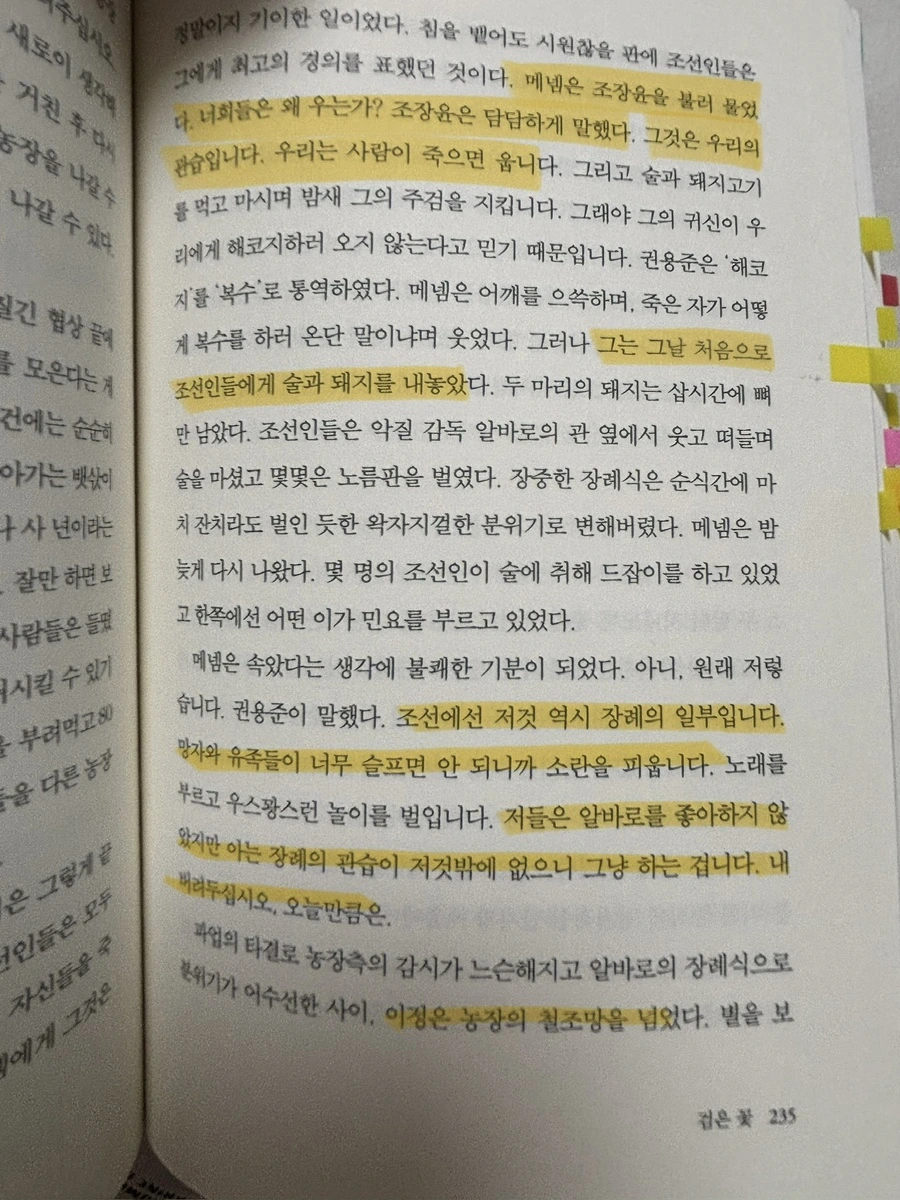 그들을 그렇게 괴롭히던 사람의 죽음에도 조선인들은 눈물을 흘리고 여느 장례식과 마찬가지로 왁자지껄한 분위기로 망자를 보내줍니다.