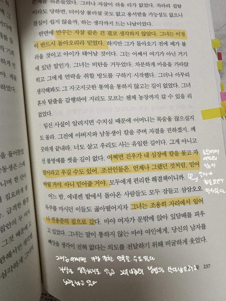 그녀는 약하지 않았죠. 살아남기 위해 그녀는 통역원 권용준의 집으로 향합니다. 연수는 이 소설에서 가장 강한
