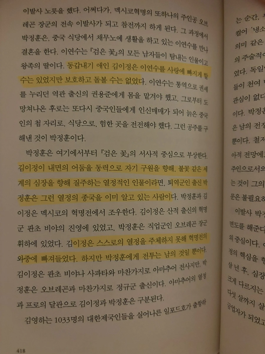 검은 꽃에는 등장하는 인물도 매우 다양합니다. 양반, 퇴역군인, 도둑, 파계 신부, 박수무당 등등 다양한 인물들이 등장할 때 이야기도 흥미 돋습니다. 소재는 무겁지만 읽기는
