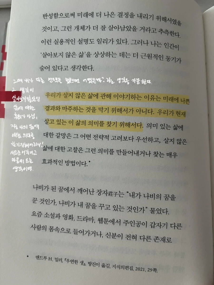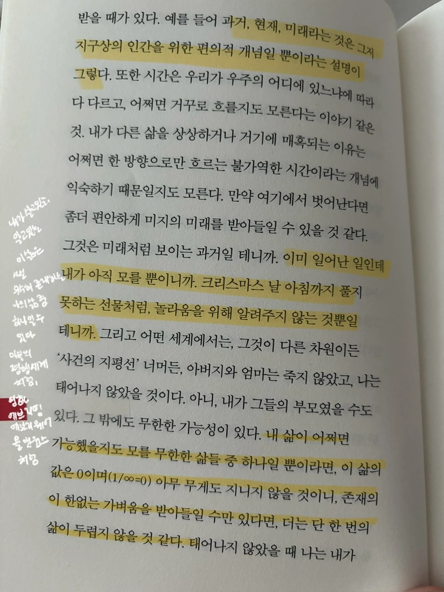 마블의 멀티버스나 영화 '에브리싱, 에브리웨어, 올엣 원스'처럼 우주에는 수많은 다른 삶을 살고 있는 내가 있을 수 있다는 생각을 많이 하는데요. 이 책을 읽으면서 수많은 삶이 이 우주에 존재한다면 지금 내가 살고 있는 이 삶의 무게가 그렇게 무겁게 느껴지지는 않다는 생각이 들었어요.