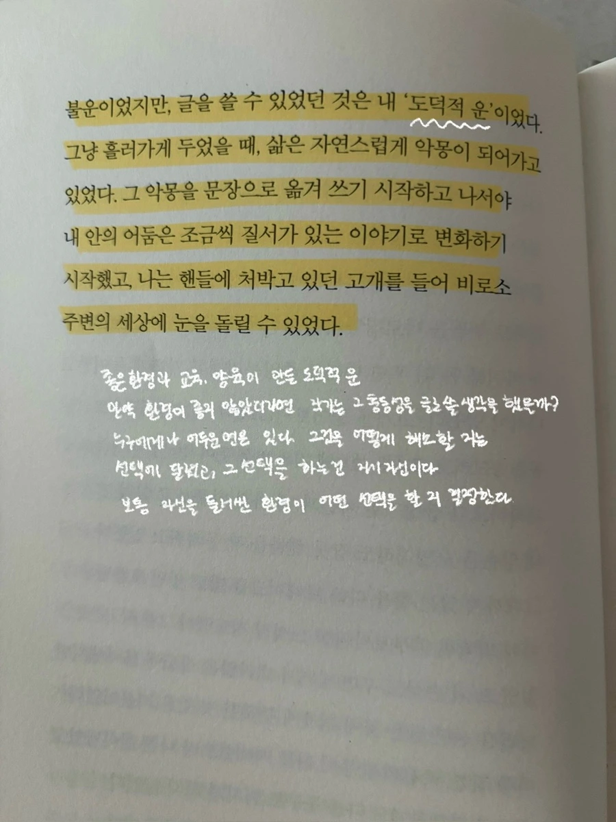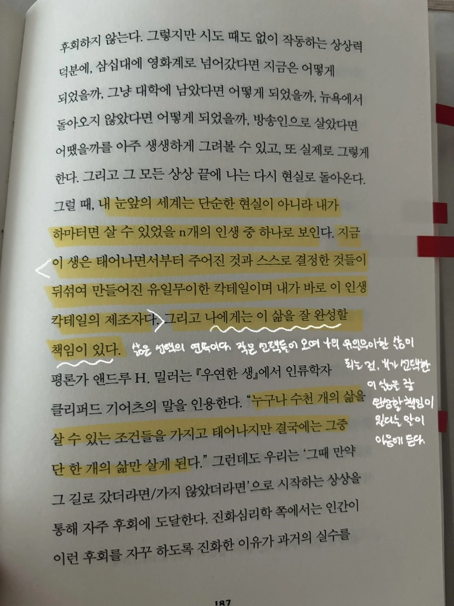 태어나면서 주어진 것들은 선택할 수 없지만 살면서 많은 선택을 하게 되잖아요. 저는 그 순간순간의 작은 선택들이 삶을 만든다고 생각합니다. 그리고 그 삶을 잘 완성시킬 책임이 있다는 말이 참 좋았어요. 되는대로 산다가 아니라 내 삶이 어떻게 되느냐는 내 손에 달려있다는 거잖아요. 이 부분을 읽으면서 내가 하고자 하면 뭔가.. 그렇게 될 것 같고 ㅋㅋㅋ 아무튼 왠지 모를 자신감이 생기더라고요.