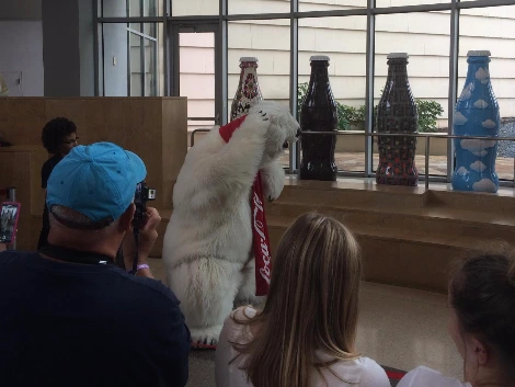 로비에 있다 보면 그 유명한 코카콜라의 폴라베어가 어슬렁어슬렁 나타난다. 겨울이면 광고로 찾아오는 그 폴라베어다. 그런데 귀여운 폴라베어를 기대하고 가면 자칫 놀랄 수 있다. 월드 오브 코카콜라에 있는 곰은 코카콜라 광고에 처음 나온 폴라베어의 모습을 그대로 답습하고 있기 때문에 덩치가 상당히 크고, 또 무섭게 생겼다. 특히나 압권은 눈이었는데, 영상에서는 잘 보이지 않지만 눈이 정말 빨갛다. 그래서 눈을 쳐다보기가 쉽지 않다. 처음 봤을 때 든 생각은 ‘좀 high한 곰인가..?’였다. 그만큼 충격적이었다.