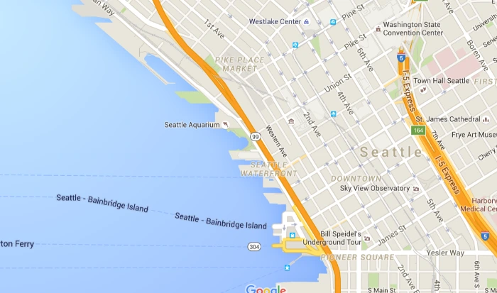 다운타운과 파이크 플레이스 마켓은 서로 붙어있고 또 바로 바다를 마주하고 있다. 파이크 플레이스 마켓에서는 항구와 저 멀리 태평양으로 나가는 뱃길도 볼 수 있다.