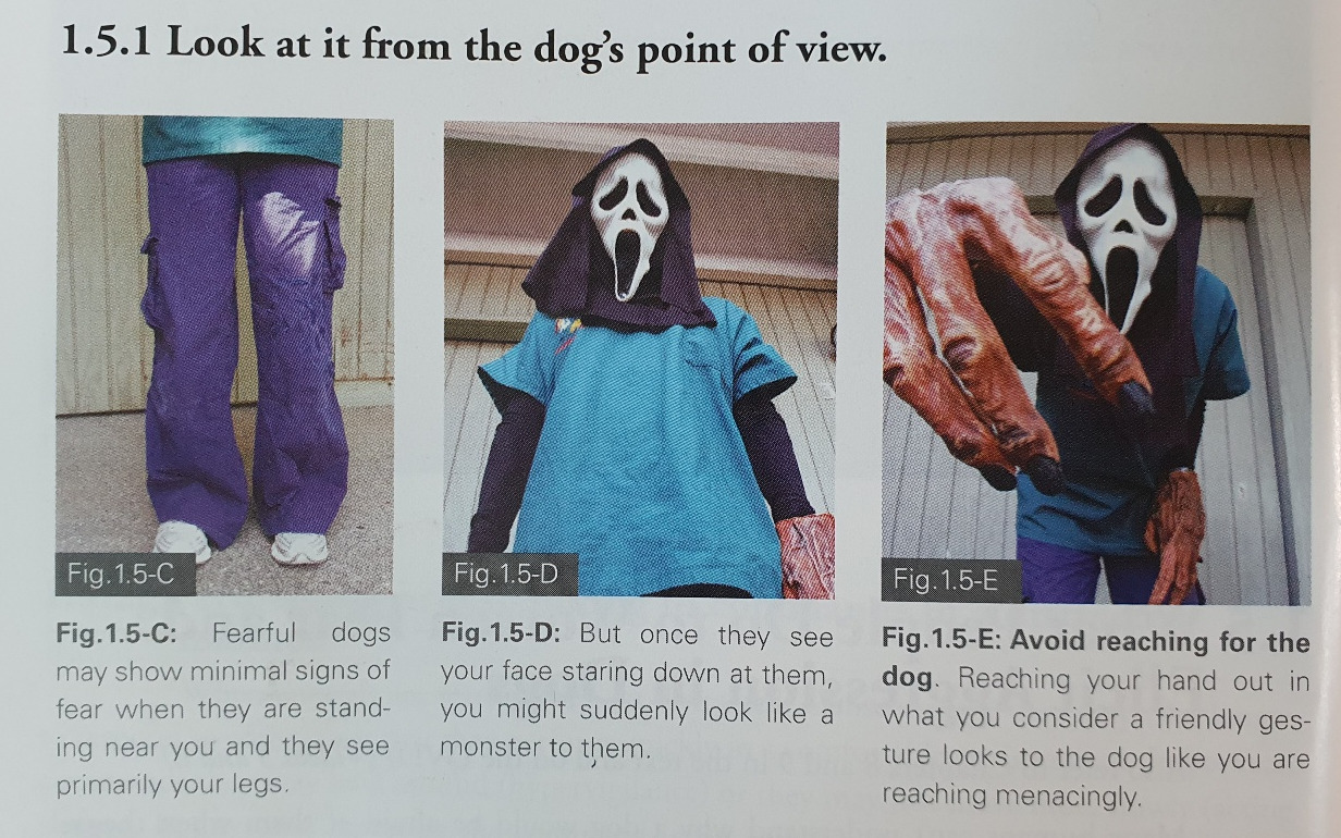 미국의 동물행동학자이자 수의사인 소피아 잉 (Sophia Yin)은 자신의 저서 ‘개와 고양이의 스트레스 최소화 핸들링, 보정, 행동 수정’ (Low stress Handling, restraint, behavior modification Dogs & Cats) 에서 두려운 개에게 사람이 어떻게 보이는지 사진과 같이 표현했습니다.