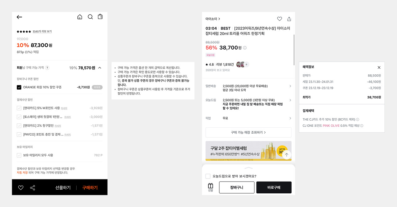 사용자에 따라 다르게 적용받을 수 있는 쿠폰, 결제수단 할인 등 항목에 대해서는 세부 내역을 확인할 수 있게 합니다.