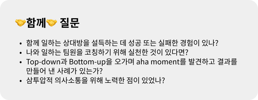내가 기대한 만큼 협조해주지 않는 동료가 있을 때 속으로 그를 비난했습니다. 하지만 되돌아보니 이런 상황은 언제든 일어날 수 있고, 그럼에도 불구하고 일이 잘 굴러가게 만들 수 있는 plan B를 곧바로 실행할 수 있는 것이 훌륭한 PM이란 생각이 들었습니다. 잘하는 실무자를 넘어 함께 잘하는 협력자로서의 태도를 고민하게 하는 사건이었습니다.