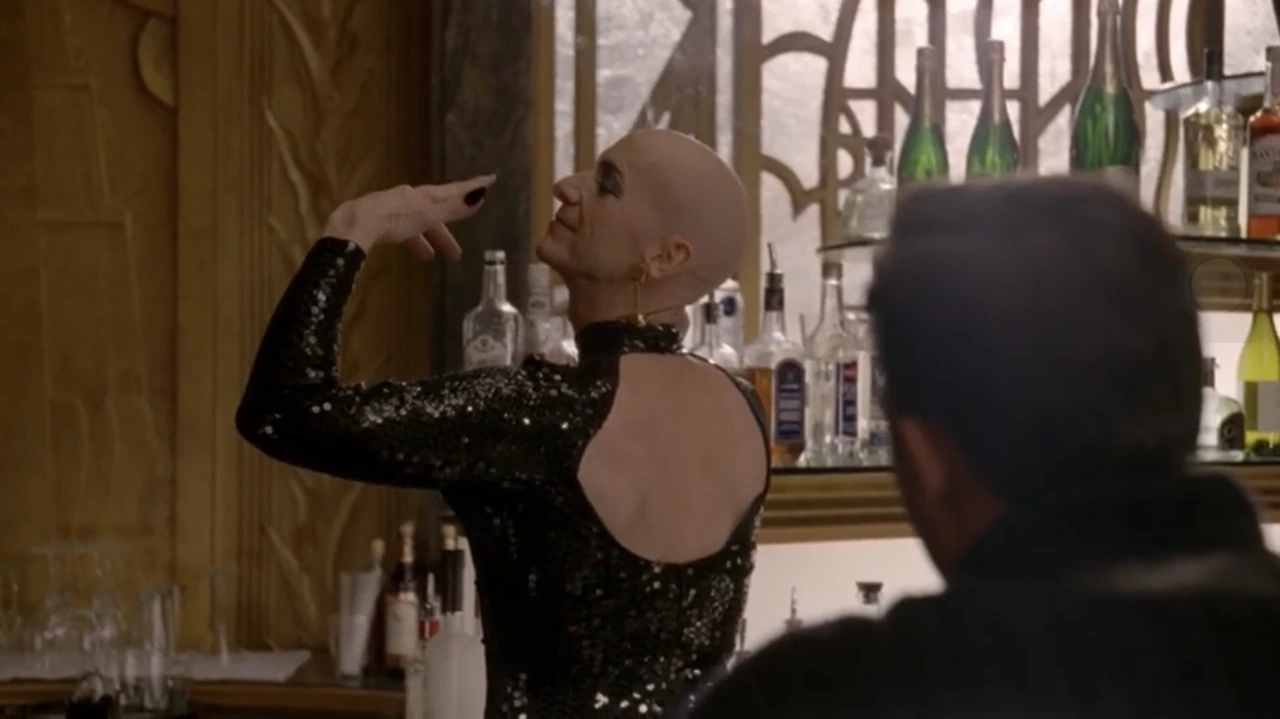 완벽한 메이크업과 패션은 거들 뿐, 아우라를 완성하는 건 태도다. 바에서 능숙하게 대충 술을 따라주고, 귀찮지도 않다는 듯 시체를 버리고, 눈을 내리깔거나 가늘게 뜨고, 허리를 살짝 옆으로 튼 채 팔짱을 끼고 서 있는다. 꼭 필요할 때만 하는 수 없다는 듯 입을 연다. 리즈의 입에서 나오는 말들은 그 내용도, 그것을 내보내는 방식도 철저히 우아하다. 평범한 단어도 리즈가 조합하면 독특한 표현이 되고, 흔한 관용구도 리즈의 입을 거치면 특별한 뉘앙스를 풍긴다. 데니스 오헤어는, 시스젠더 남성 배우들이 트랜스젠더 여성을 연기할 때 흔히 하는 실수-혹은 의도적인 혐오-를 답습해 희극적으로 새되게 꾸며내지 않고, 음색을 유지하며 톤을 섬세하게 올렸다. 발성은 풍부하고 정확하며, 억양은 드라마틱하나 이음매가 부드러워 귀에 녹아든다. 오 그 투로 내보내는 대사들은 어찌 그리 무심하면서도 성의 가득한지. 클라-스가 다르다. 그 바탕 중 일부는, 손에서 놓지 않는 고전 문학일 테다.