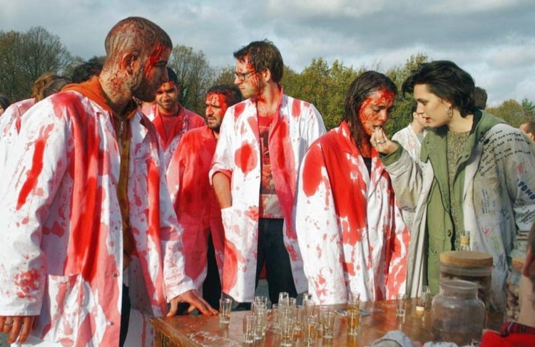 둘 모두 가족에 의해 능력이 숨겨졌으나, 델마의 경우 ‘비능력자’인 가족이 그의 능력을 알게 된 후 이루어진 억제였다면(‘쟤는 우리와 다르다’), 쥐스틴의 경우 부모의 유사한 경험이 선행된 ‘관리’에 가까웠다(‘쟤네는 나와 같다’). 델마의 억압은 집에서 이루어졌고, 학교는 부모의 감시에서 벗어나 욕망을 경험하는 해방의 공간이었다. 쥐스틴에게 학교는 위계/전통에 기반한 폭력을 겪는 공간이다. 침구를 밖에 던져놓는 식의 단순한 괴롭힘도 있지만 대개는 이성애규범적인 방향으로 구체화된다. 선배들은 여성혐오적인 표현과 동물학대의 묘사가 있는 노래를 합창하고, 춤추며 밤을 새도록 강제하거나 남학생과 여학생을 한방에 가둔다. ‘오늘 여자애들은 핫하게 입어야 한다’며 거부하는 경우 기저귀를 채우기도 한다. 신입생들은 두려워하다가도 즐거워하며, 네 발로 기어 들어온 클럽에서 열심히 몸을 흔든다. 쥐스틴 역시 빨간 물감을 뒤집어쓰고도 웃으며 목청 높여 구호를 외쳤다. 언뜻 억제와 자유가 공존하는 듯 보이나 그것은 기만, 강제적 자유에 적응하지 못하는 자들은 낙오된다. 쥐스틴의 경우 육식을 강요당하고 몸이 반응하면서 ‘내 문제’로 체험하게 되는데, 그 ‘피해’로 인해 ‘가해’의 가능성을 지닌 존재로 거듭나게 된다.