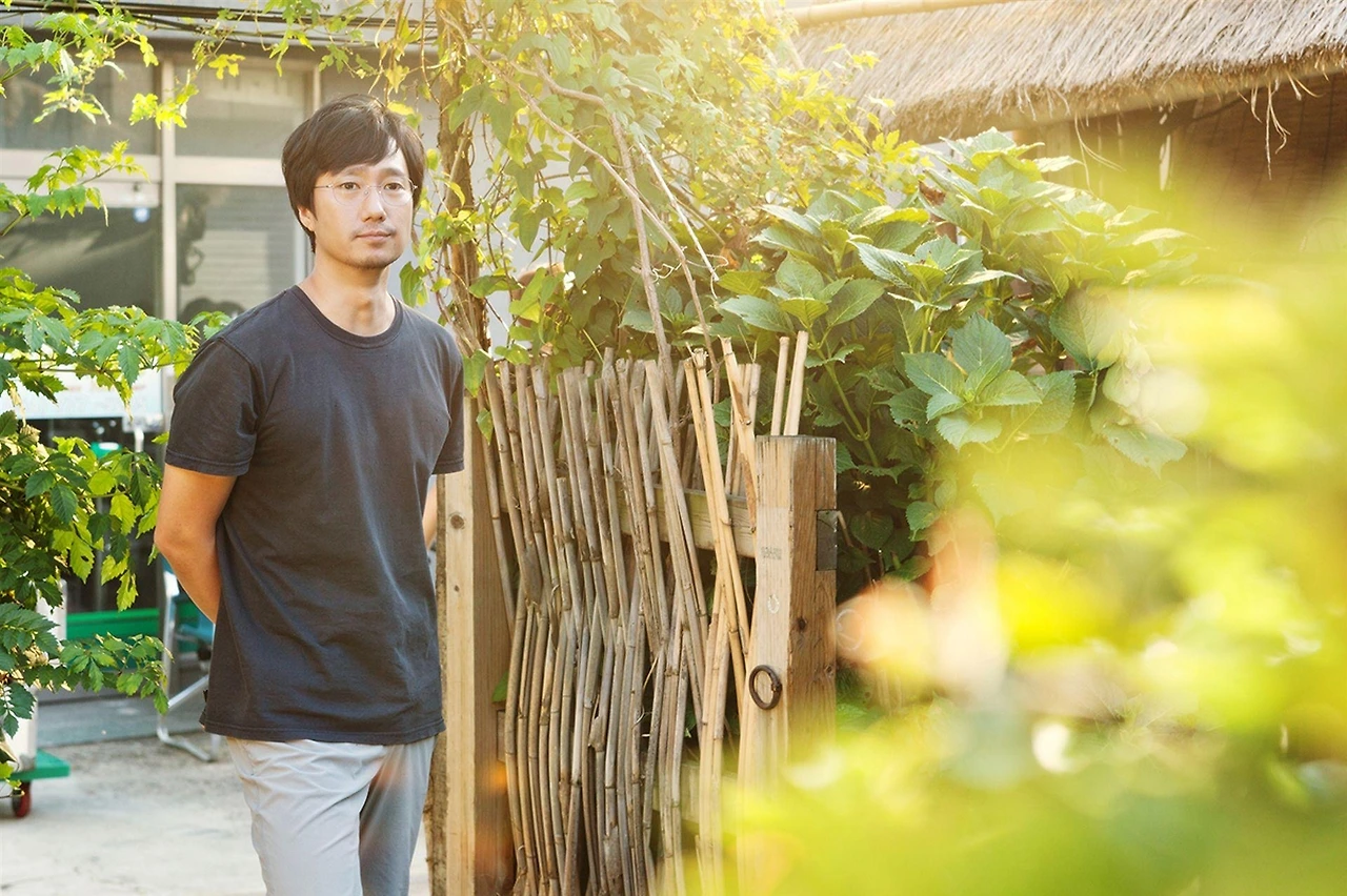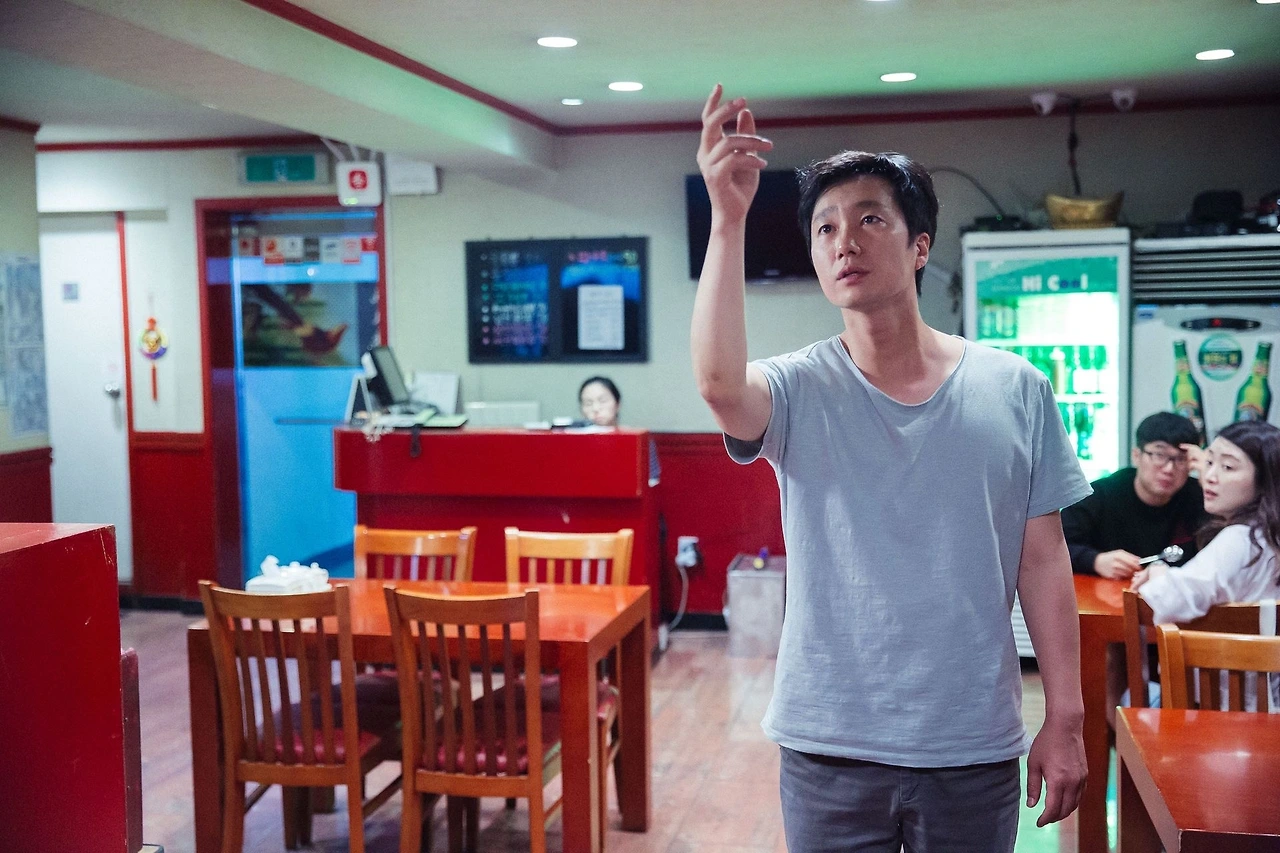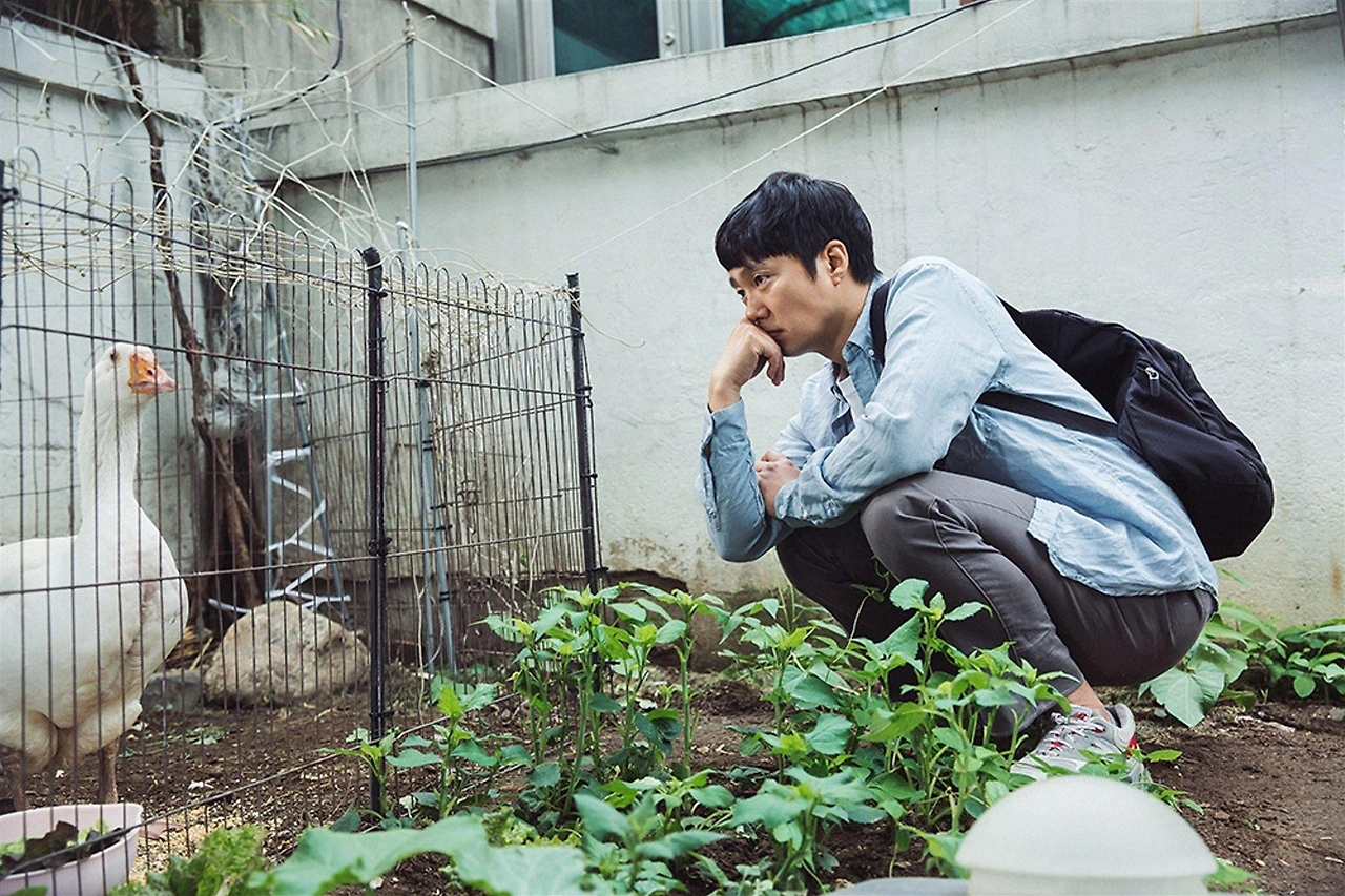 그러고 보면 호감이나 욕망, 질투와 원망이 표현되는 형태도 좀 남달랐다. “넌 옷이 그거밖에 없냐.”는 핀잔과 함께 먼저 일어나는 송현의 뒷모습을 몹시 사랑스럽다는 눈길로 따랐고, ‘원장님’ 앞에서는 공손하고 이상하게 쭈뼛거렸다. 노래방 앞에 털퍼덕 주저앉아 해맑게 웃거나, 반말과 존댓말을 절묘하게 섞어 쓰는 자연스럽고 사소한 모먼트들부터- “뭐 좀 만져보게”라며 쇄골을 쓰다듬는 섬세하게 숨막히는 움직임, “계산은 저 여자가 할 겁니다.”라고 말하는-‘골이 났지만 감히 무례하지 못한’ 투 하며, 대나무 사이에 얼굴을 두고 뚱하니 노려보는 눈빛까지. 사람이 좀, 그렇다. <경주>의 그들이 현을 ‘좀 이상하다’고 했던 것에 비해 이곳의 사람들은 다양한 언어로 윤영을 수식한다. “젊은 사람이 옛날 정서가 살아있네?”(백화), “넌 하는 짓도 애매하고 하는 말도 애매하고.”(송현), “선과 악이 같이 있네.”(원장님) 이 말들은 작품을 넘나들며 박해일에게 적용된다. 제스처만 다르다고 남달라지는 건 아니잖는가. 천연덕스럽게 어정쩡한 몸짓과 묘하고 처연한 눈빛, 최현만큼 독특하진 않더래도 절대 ‘노말한’ 범주에 끼워 넣을 수 없는 윤영의 분위기는 박해일만의 것이다.