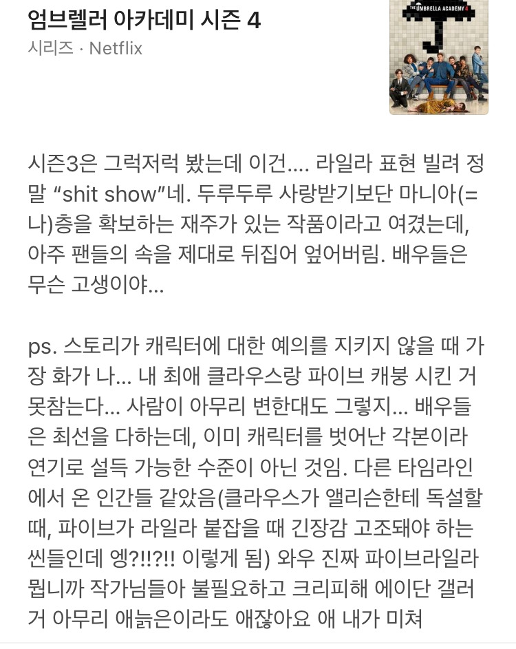 최근에 <다크>를 보고, “아담과 이브가 살아남아서 ‘자신들의’ 세상을 되살리는 전개가 아니라 자신과 자신들의 세상을 기꺼이 포기하고 사라짐으로써 하나의 세상을 구하는 결말이 정말 좋았다”고 메모했다. 엄브렐러 아카데미 크리에이터들이 혹시 여기서 영감을 받은 걸까? 아닐 수도 있지만... 설마 처음부터 이런 결말을 바라보고 달렸나 싶어 코믹스 플롯을 찾아봤는데, 시즌4 핵심 콘셉트가 원작자들에게서 비롯되기는 했으나 해당 내용을 담은 화는 아예 없고, 코믹스가 끝나려면 아직 멀었단다.[Mirror] 같은 시청자이더라도 각 쇼에서 바라는 바가 다르고- 아니 그보다 이야기와 시리즈, 캐릭터의 일관성과 정체성이라는 게… 아 제대로 된 비판을 할 에너지가 없다. 비하인드 컷 관람이 가장 보람찼다. 안녕 엄브렐러 아카데미, 즐겁다 말았고, 배우들만 다시 보자.
