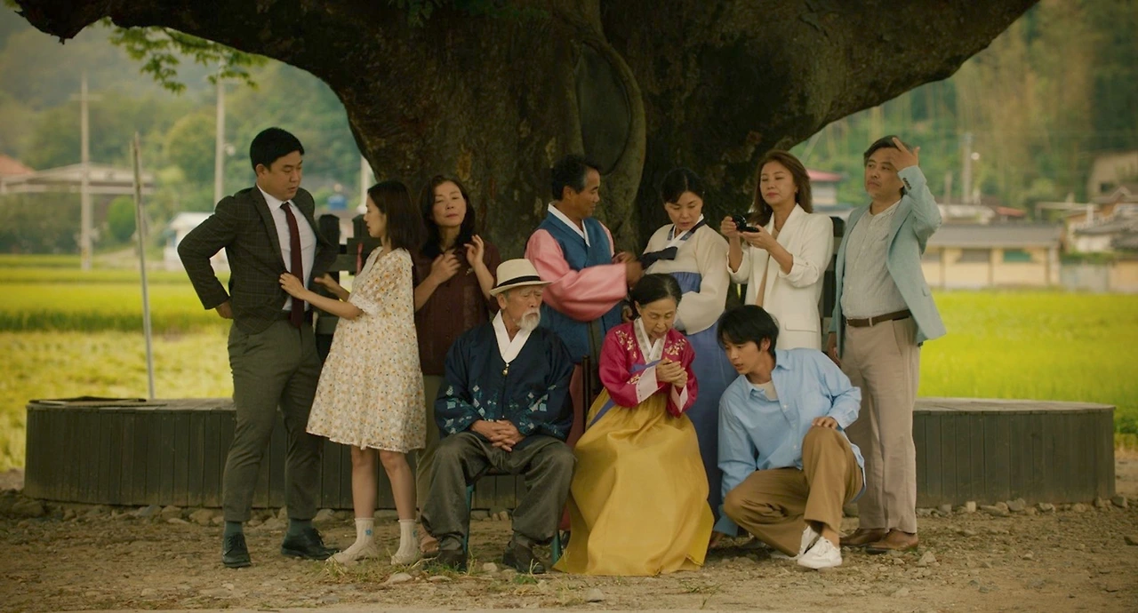 택시를 타고 마을을 떠났던 성진이 무채색 옷을 입고 장례식장에 도착하기까지, 그 사이의 시간을 영화는 생략한다. 성진이 단체사진을 잘라 만든 할머니의 영정을 꺼내 올려놓을 때에야, 관객은 비로소 누가 죽었는지 알게 된다. 이렇듯 시차를 섬세하게 활용하는 연출은 <장손>의 리얼리즘에 영화적 긴장감을 불어넣는다. 대신 사실주의적 풍자에 수반되는 긴장은 유머가 늦춘다. 마이크에 대고 ‘성진이 왔으니 에어컨 틀자’고 외치는 할머니의 모습에, 관객은 인상을 찌푸리면서도 소리내 웃고 만다. 제사의 엄숙은 여자들의 웃음으로 깨지고, 할아버지와 아빠의 팽팽한 말다툼은 아빠가 엎은 국물이 매형의 사타구니에 쏟아지는 해프닝으로 마무리된다. 눈물바다의 장례식이 끝난 후엔 ‘누구 지인이 더 돈을 많이 냈나’ 게임이 시작된다. 한밤중에 깨어나 난리를 피우는 할아버지를 진정시키기 위해 한바탕 연극을 한 후 마당에 쪼그려 앉아 조는 성진과 부모는 또 어떤가.