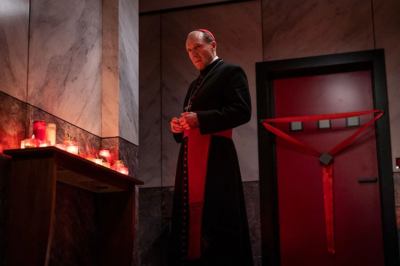 원작에서 로멜리(로렌스)의 생각은 한 줄기로 이어지기도 하나 보통의 인간이 그렇듯 이리저리 산만하게 가지를 뻗기도 한다. 한 예로, 트랑블레를 조사한 서류를 가지고 벨리니의 방을 방문한 그는 벨리니의 적대적 반응에 극심한 두통을 느낀다. 그리고 ‘몸이 아픈 추기경을 위해 마련된 숙소 투표 규정’을 떠올린다. 오로지 침대에 누워 있고 싶다는 욕구가 로멜리를 지배하는 듯하다. 당연하달지, 영화는 이런 상태들의 표현을 주로 랄프 파인즈에게 맡긴다. 동료 추기경들과 대화하고 선거운동을 부탁 받을 때마다, 심지어는 결단을 내리는 때에도 로렌스는 슬퍼 보였다. 벨리니의 확신을 목격하며 제 확신이 무너진 순간, 실망을 말하는 로렌스의 심경은 분노보다는 애도에 가까워 보인다. 그는 저도모르게 천천히 자신을 포함한 기득권을 해체하고 있었는데, 그 여정의 끝에는 투표용지에 제 이름을 적는 행위가 있다. 원작에서는 이것이 합리적 의사결정의 결과로 묘사되는 반면, 에드워드 버거와 랄프 파인즈는 로렌스가 “요한”이라는 이름을 앞서 말했음에도 죄 지은 듯 은밀하고 재빠른 움직임을 택한다. 파인즈의 퍼포먼스는 긴박한 리듬을 소화하면서도 끊임없이 그것을 끊으며 되돌아보게/사유하게 한다. 원작에서 상당한 비중을 차지하는 어마어마한 번뇌의 서술이 이 배우의 신체에 그대로 잠겨 있다. 랄프 파인즈를 좇다 보면 주제가 자연히 마음 속에 내려앉는다.