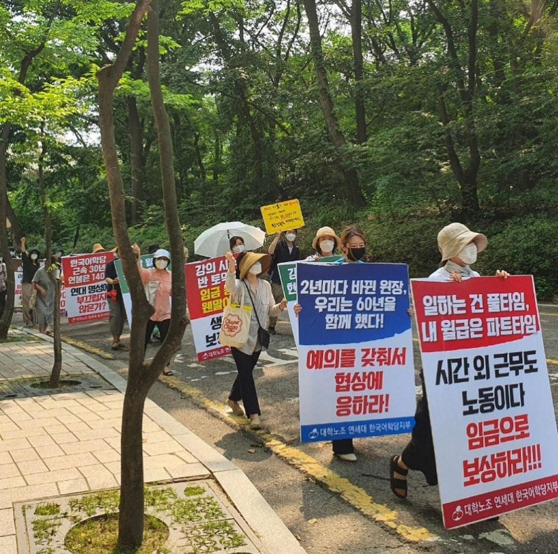 성큼 찾아온 봄에도 어딘가 황량해 보이는 교정에서, 강사들은 피켓을 들고 학교를 행진했다. 코로나 19로 인해 학교를 오가는 발걸음이 줄어든 만큼 강사들의 이야기는 충분히 전해지기 어려웠지만, 그들은 자리를 떠나지 않았다. 강사들의 투쟁이 한창이던 2021년 8월 12일, 공일오비는 그들의 이야기를 듣고자 문우, 연세지, 연세춘추와 함께 비대면 기자회견을 가졌다. 다양한 질문과 답변들 속에서 한국어학당 강사들이 겪어 온 일들이 조금씩 선명하게 다가왔다. 강사들은 생계를 유지하기 어려울 정도로 낮은 임금과 제대로 보장되지 않는 수업 시수, 고용 및 노조 활동의 불안정성을 폭로하며 학교 측에 책임을 묻고 있었다.[1] 작년부터 학교와 단체협약안을 마련하기 위한 협상을 이어왔지만, 여전히 안일하고 불성실한 학교 측의 태도를 보다 못한 강사들은 피켓을 들고 목소리를 높였다. 강사들은 “이제부터 본격적으로 학교 측과 다툴 예정”이라며 쓴웃음을 지었다.
