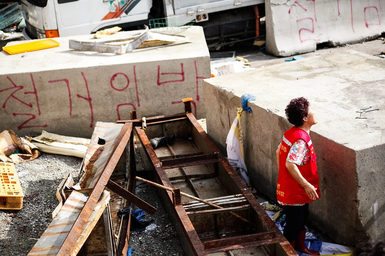 UN 주거권 특별보고관 레일라니 파르하가 작년에 한국을 방문하곤 “한국 시민들은 하루하루 살아가면서 주거권을 주장할 수 있다는 인식조차 없다는 것을 느꼈다”는 말을 남기고 갔다. 서울 곳곳의 개발 사업지엔 투기꾼과 부동산 기업이 몰려들며 원주민과 세입자가 밀려나는 일이 반복되지만, 쫓겨나는 사람들은 어쩔 수 없는 짐짝처럼 취급된다. 내가 선택한 이사에도 아쉬워하고 슬퍼하는 사람들은 한순간에 생계가 파괴된 채 떠나야 하는 사람들에겐 냉정하다. 월세를 12배 올려 세입자를 쫓아내면서 ‘시장가치’ 운운하는 건물주 앞에, 권리 행사를 ‘떼쓰기’로 낙인찍는 사람들 앞에선 쓸려나가는 것 외에 다른 방도가 없다. 그러나 구시장 상인들은 쓸려나가길 거부하며 자리를 지켰다. 그러자 이들에게 명도집행과 공실 관리를 명분으로 무차별적인 폭력이 가해졌다.
