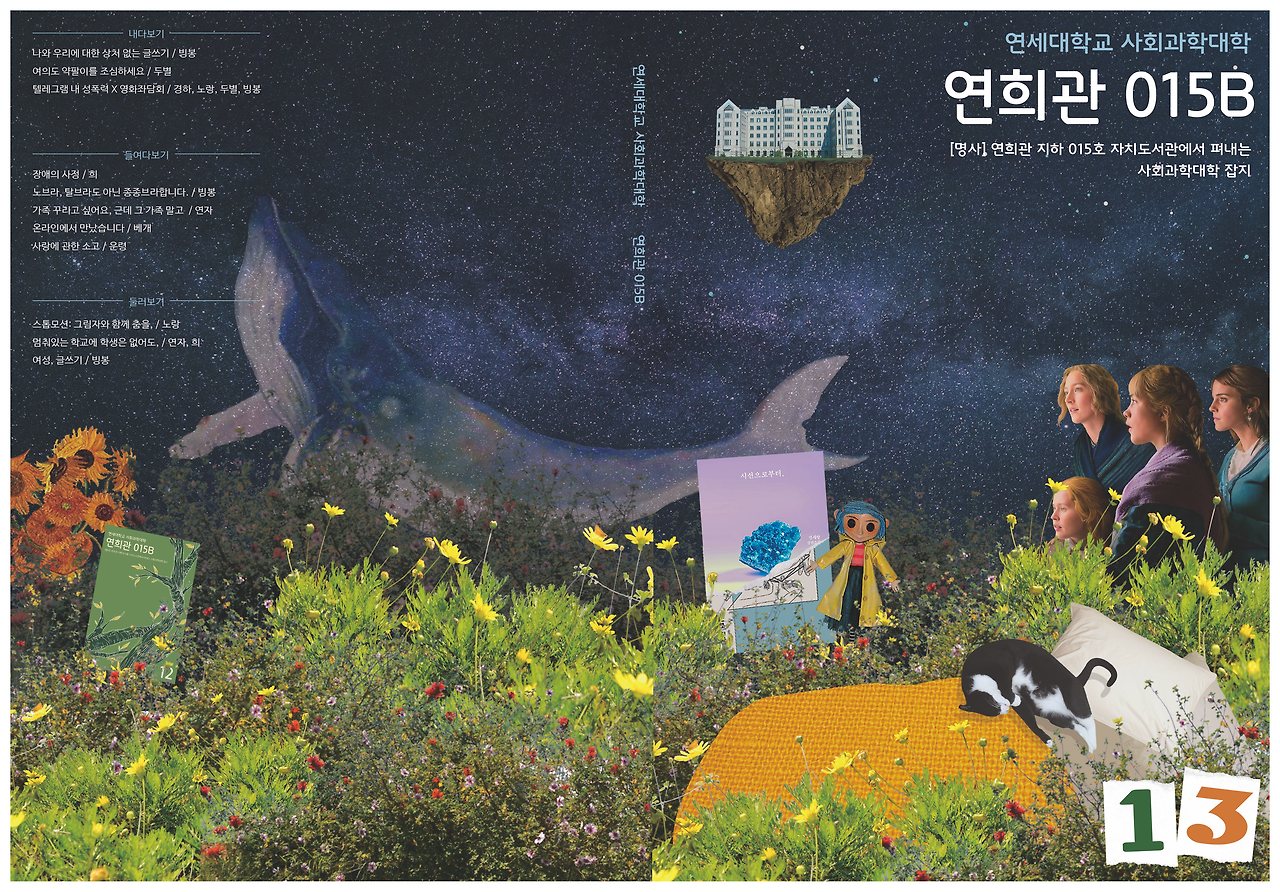 이번 연희관 015B 13호도 편집위원들끼리 각자의 생활공간에 흩어진 채, 동시에 이어질 수 있는 방식을 계속해서 고민하며 펴내게 되었습니다. 컴퓨터 화면을 통해 열심히 이야기를 나누고, 흩날리는 손글씨 대신 정갈한 폰트로 의견을 주고받았습니다. 그런 와중에는 가만히 밖을 내다보다가, 지긋지긋하고 피곤한 일들을 목도하고 또 눈을 질끈 감다가. 나를 살게 하는 것들을 곱씹은 후 다시 주변의 이야기들을 넌지시 둘러보기를 반복했습니다. 그 시선에 맞춰 이번 13호를 찬찬히 풀어봅니다.