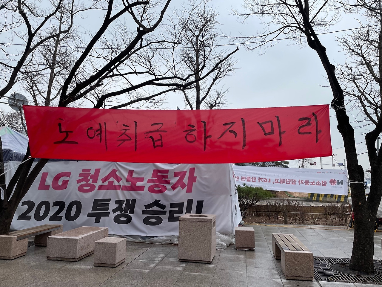 LG트윈타워의 청소노동자들은 싸우고 있다. 2020년 여름부터 청소노동자들이 고용 승계를 위해 피켓시위를 한다는 소식을 접했는데, 해가 바뀌어 봄 향기가 물씬 풍기는 지금까지도 그 소식이 들린다. 이들의 농성이 길어짐에 따라 신문이나 포털사이트에서 LG트윈타워와 관련한 기사들을 쉽게 찾을 수 있다. 코로나19로 외출이 잦지 않은 요즘은 외부의 상황을 주로 온라인 매체를 통해 알게 되니, 투쟁 현장을 취재해 꾸준히 업로드되는 기사들이 새삼 고맙기까지 하다. 어라. 마침 찾은 이 기사는 며칠 전에 게시된 따끈따끈한 기사다. 클릭.